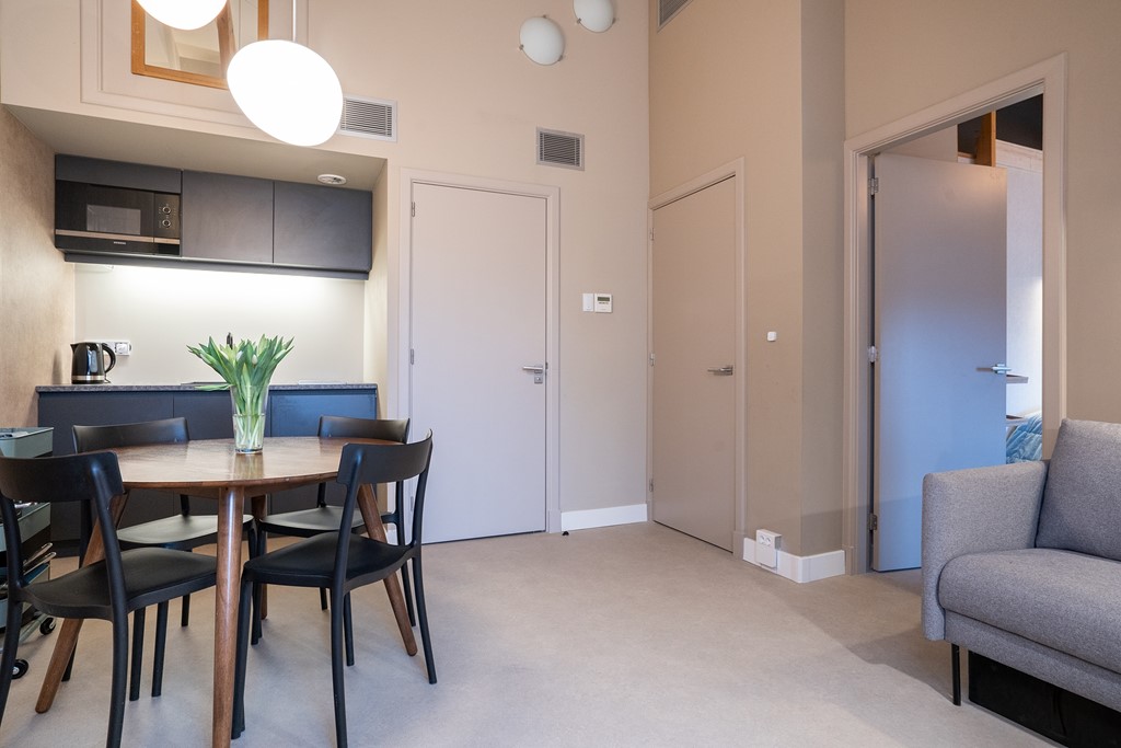 Entree appartement, hal met garderobe, separaat toilet, sfeervolle woonkamer welke is ingericht met smaakvol design meubilair en authentieke details zijn behouden, open moderne keuken voorzien van diverse inbouwapparatuur zoals: koelkast, vaatwasser, 2-pits kookfornuis en magnetron.