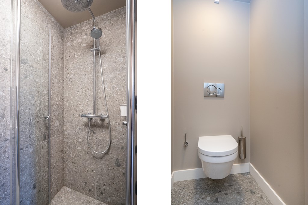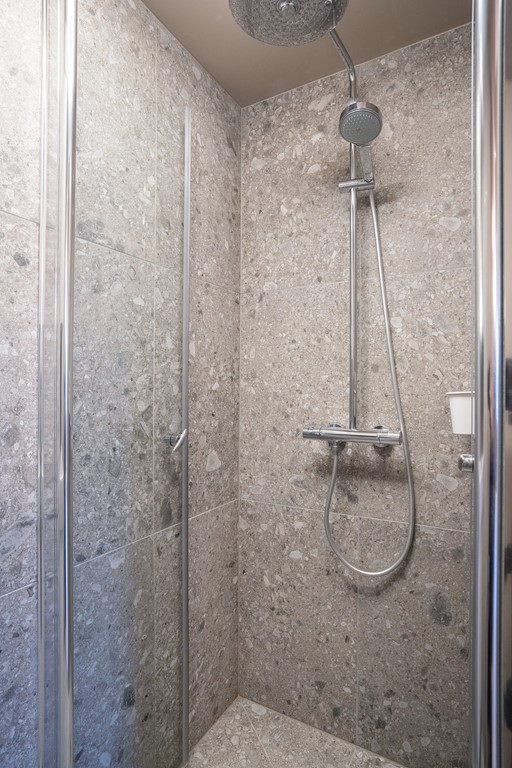 De moderne badkamer is vanuit de woonkamer bereikbaar, welke is voorzien van luxe douche en wastafel.