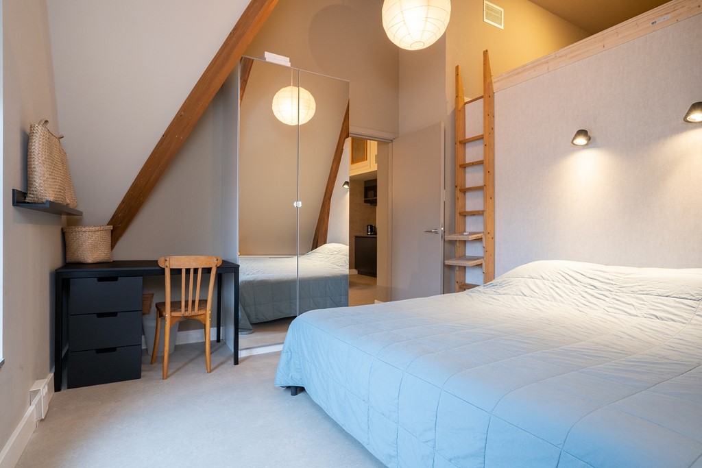 Vanuit de woonkamer loop je door naar de lichte Masterbedroom, in deze Masterbedroom is een werkplek aanwezig zodat je makkelijk vanuit huis kunt werken. Ook is er aan extra ruimte gedacht, er is namelijk een ruime vide gecreëerd in de kamer zodat er eventueel een extra ''tweede'' slaapplek is voor gasten of kunt gebruiken als bijvoorbeeld opslag.
