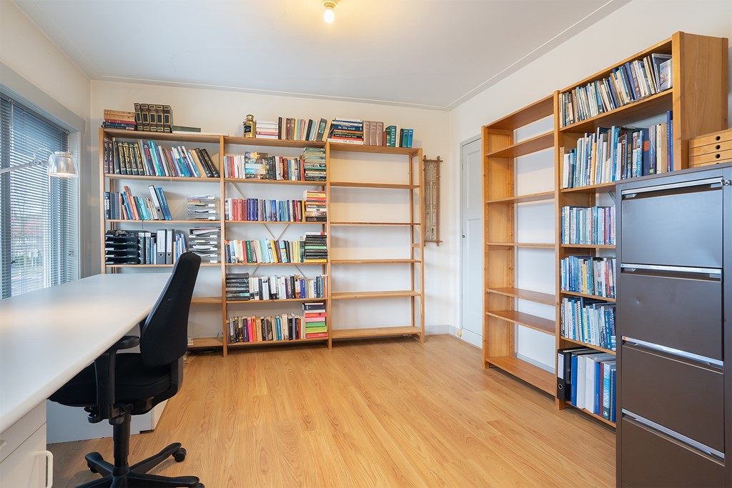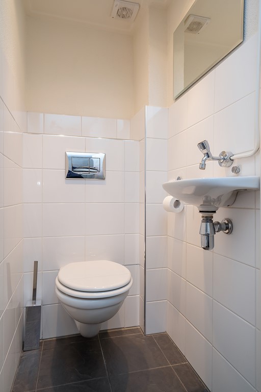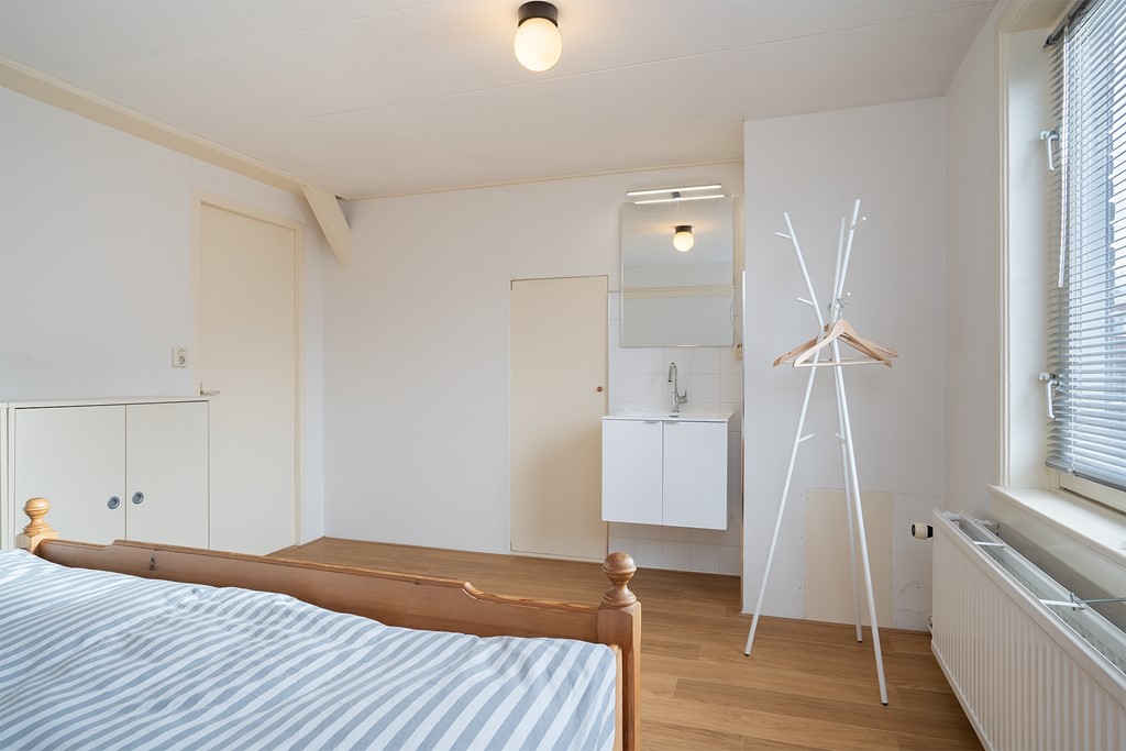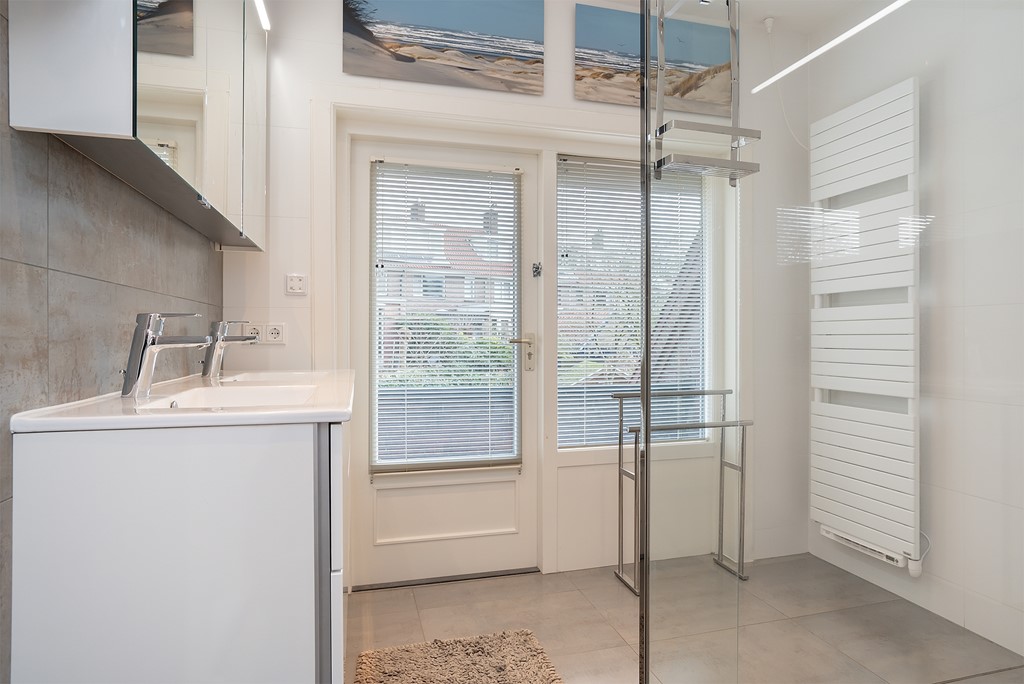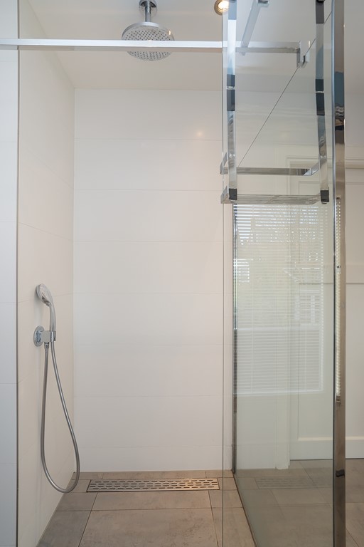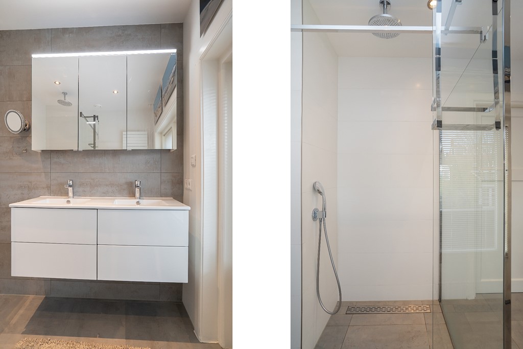 overloop, separaat toilet, moderne badkamer met inloopdouche, dubbele wastafel en vloerverwarming. Naast de badkamer is de Masterbedroom, deze slaapkamer ligt aan de achterzijde van de woning. Aan de voorzijde van de woning ligt de tweede slaapkamer welke momenteel in gebruik is als werk/ studeerkamer.