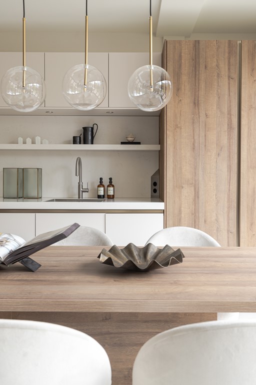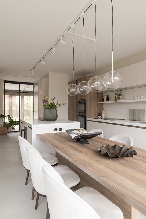 De luxe open keuken vormt het hart van de woning en is uitgerust met de modernste apparatuur, waaronder een Bora inductiekookplaat met geïntegreerde afzuiging, een Quooker-kraan en een ingebouwde wijnkast. Het royale kookeiland fungeert tevens als eettafel en creëert een gezellige en praktische leefruimte.