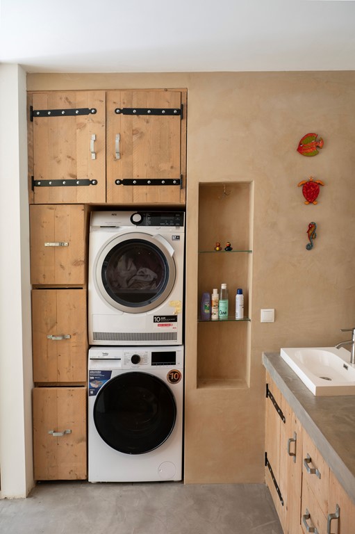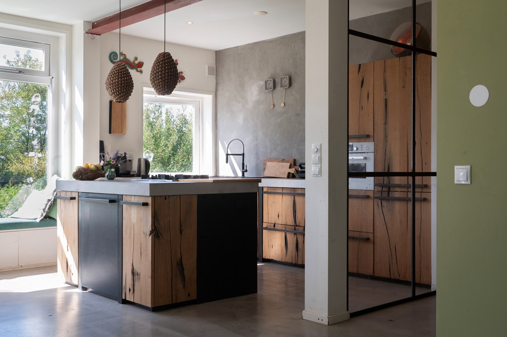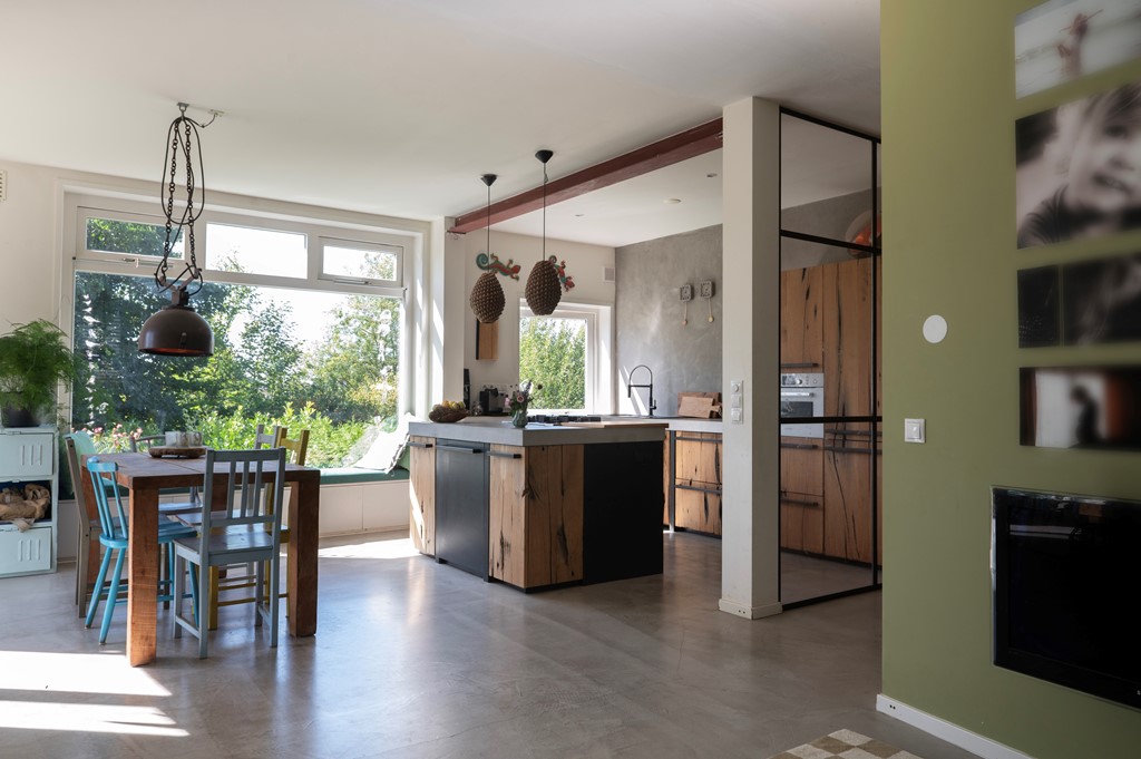 Via de entree stap je binnen in een lichte, open leefruimte waar wonen, koken en eten samenkomen. De ruimte is voorzien van een strakke gietvloer en staat in open verbinding met de moderne keuken. Deze keuken met kookeiland is uitgevoerd in warm hout en uitgerust met alle gemakken. Hier kook je met uitzicht op de groene achtertuin. Het grote raam met brede vensterbank, waar je heerlijk op kunt zitten, biedt uitzicht op de fraai aangelegde tuin. Vanuit de keuken stap je zo het royale terras op, met een trap naar de lager gelegen tuin.
