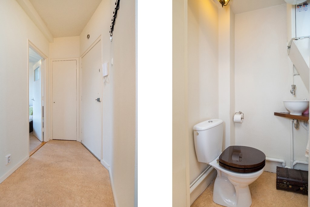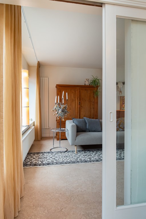 Het appartement zelf verwelkomt je met een ruime hal met garderobe, meterkast en aansluiting voor wasmachine en droger. Vanuit hier wandel je door naar de royale werkruimte, die overloopt in de lichte woonkamer.