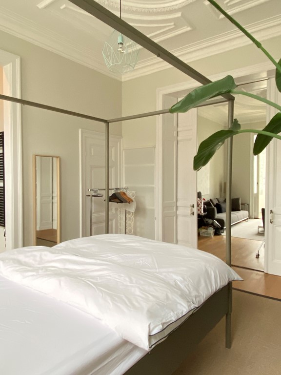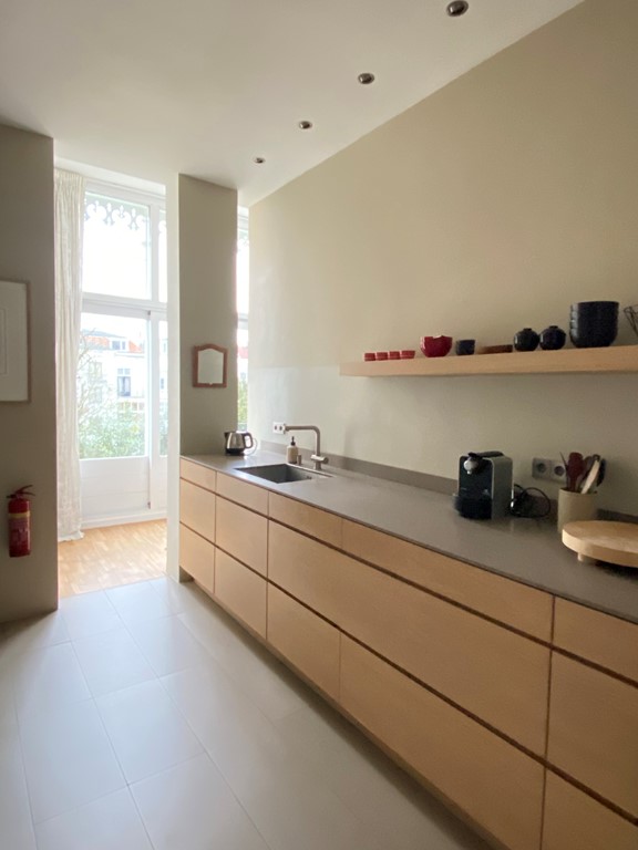 Ruime compleet ingerichte keuken voorzien van groot fornuis en bijkeuken met wasmachine. 2 Kamers met houten vloeren, hoge ornament rijke plafonds en grote schuifdeuren waarmee de 2 vertrekken kunnen worden gescheiden. Elke kamer beschikt over een originele statige zwart marmeren schouw. Lichte badkamer met ruime inloopdouche.