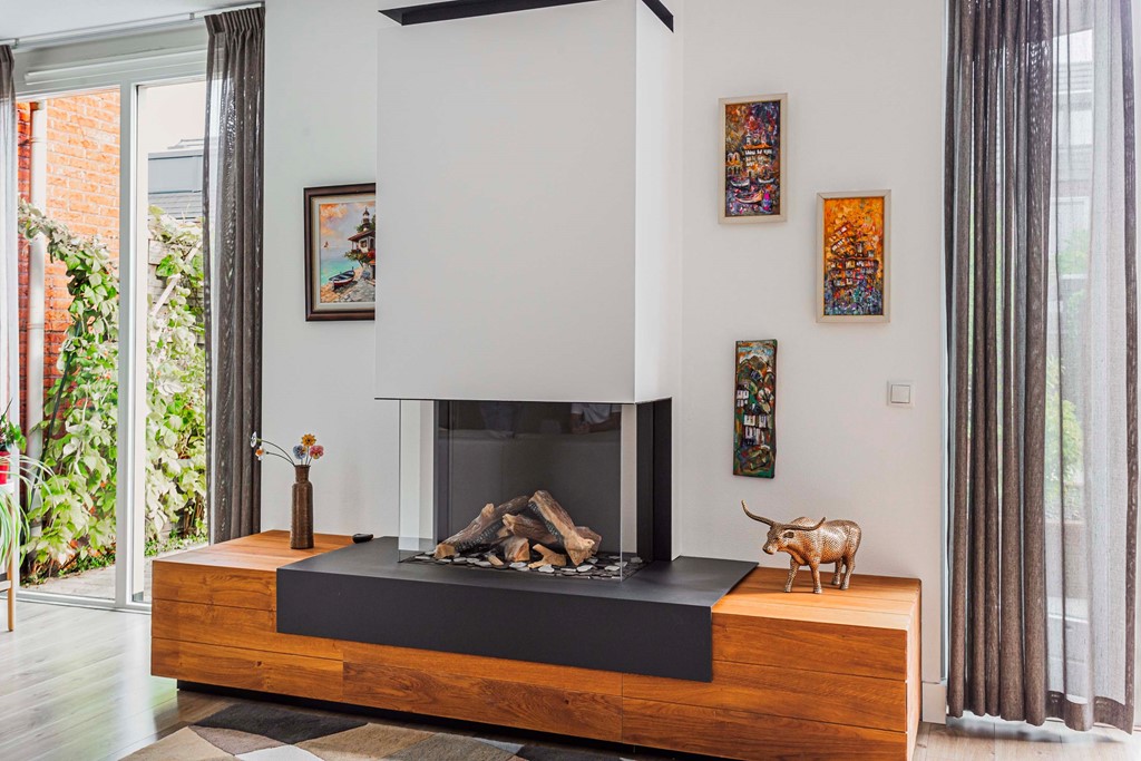 De woning beschikt over een ruime, lichte woonkamer met een sfeervolle gashaard en grote raampartijen. Bij de bouw en afwerking is gebruikgemaakt van hoogwaardige materialen, wat direct terug te zien is in het verfijnde niveau van comfort en duurzaamheid. De separate keuken is volledig uitgerust met moderne inbouwapparatuur en beschikt over een gezellige bar, perfect om aan te ontbijten of te borrelen.