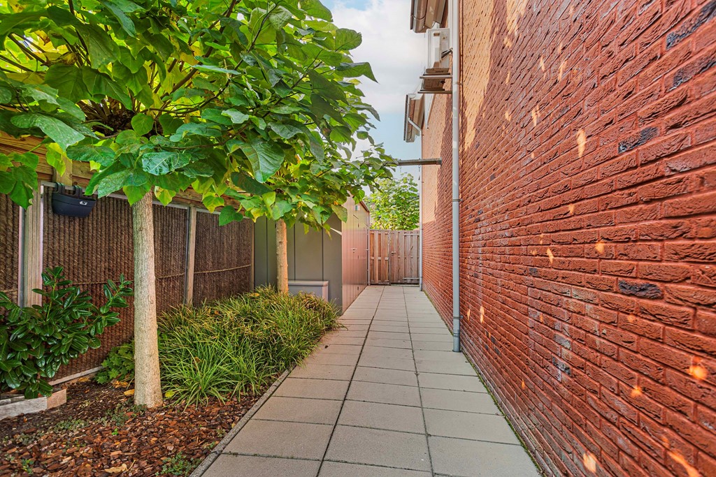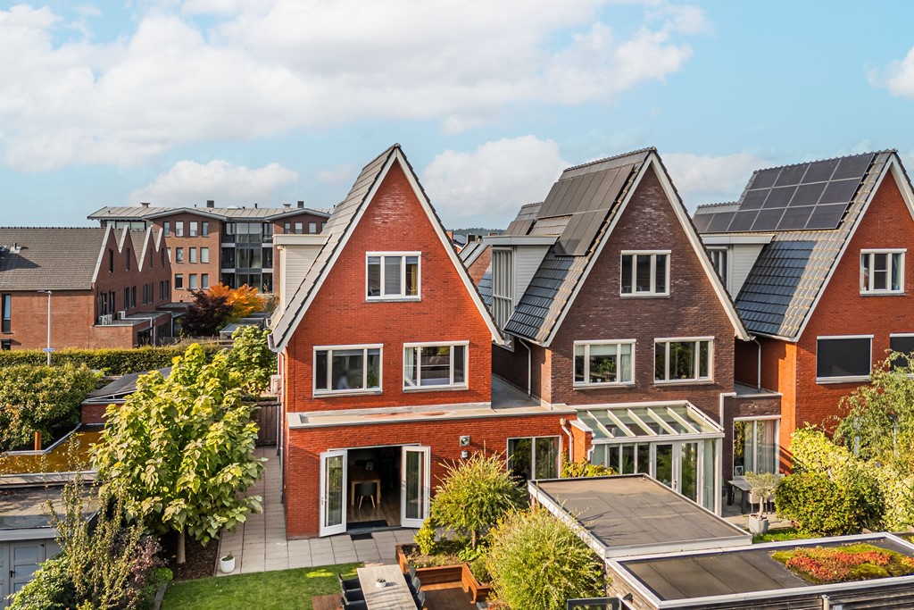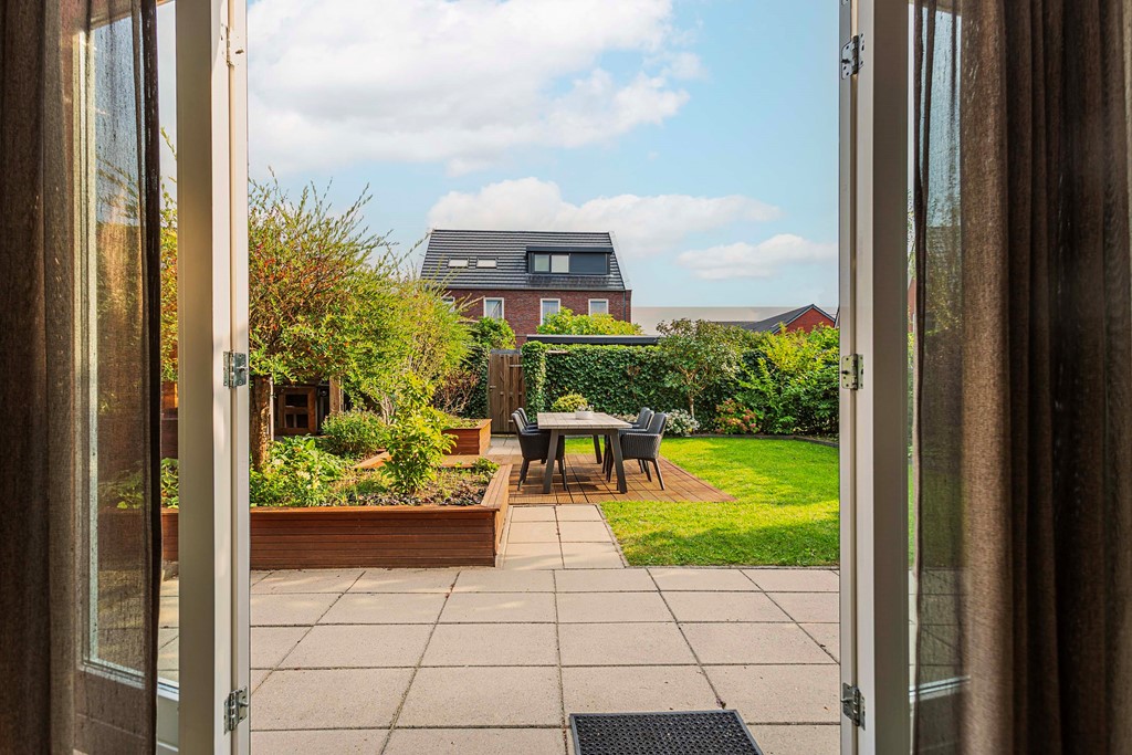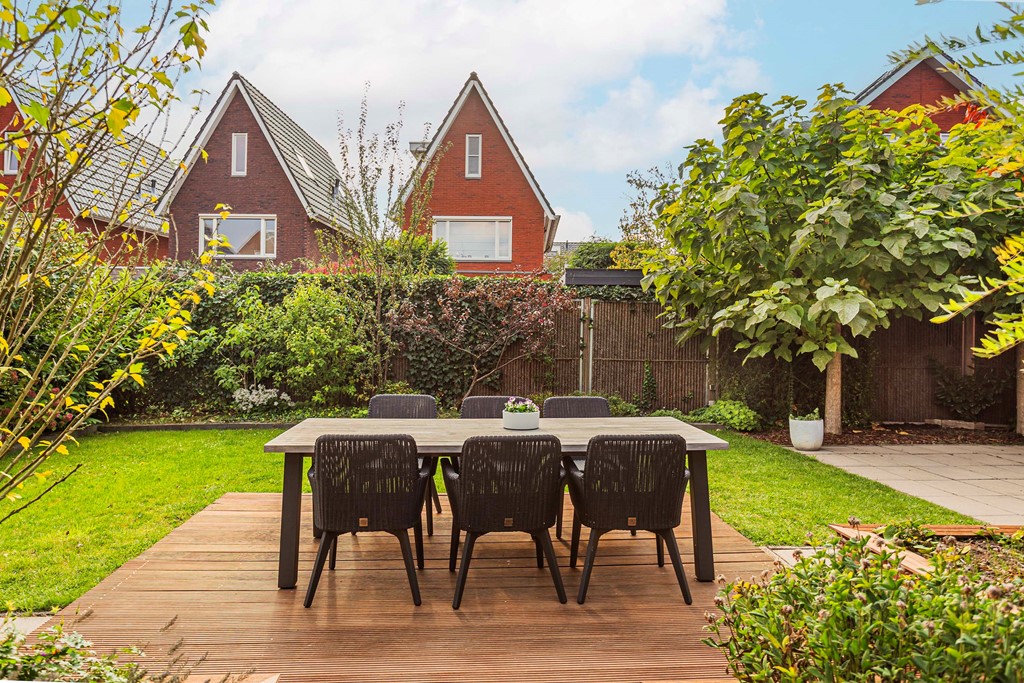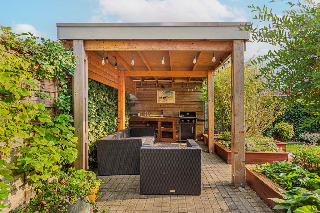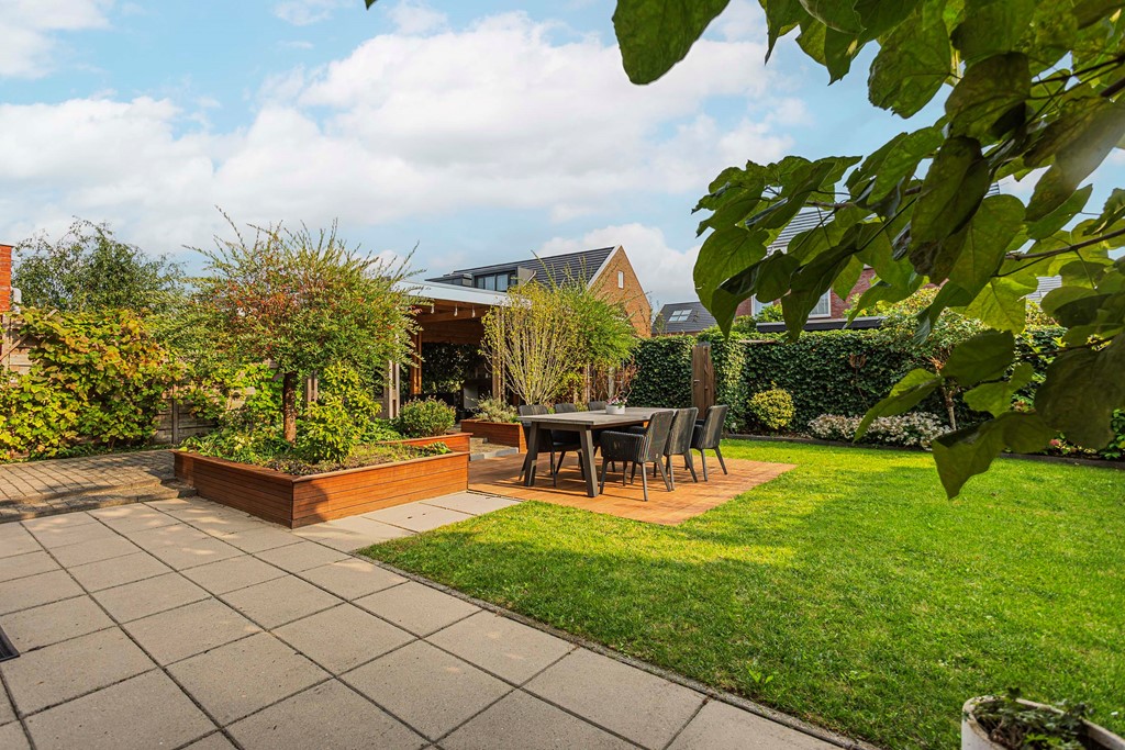 De grote achtertuin is smaakvol en praktisch aangelegd en beschikt over een veranda met buitenkeuken en barbecue, een ruim terras, een grasveld en fraai beplante borders. Daarnaast zijn er twee bergingen aanwezig en is er een eigen achterom. Op de oprit bevindt zich bovendien een laadstation voor een elektrische auto.