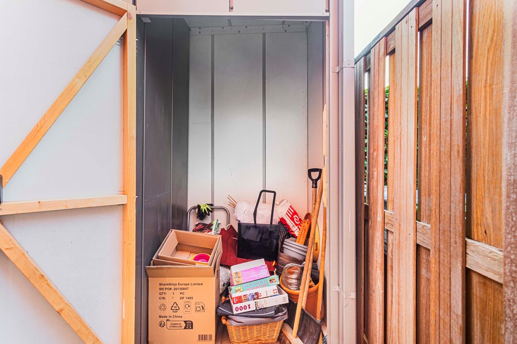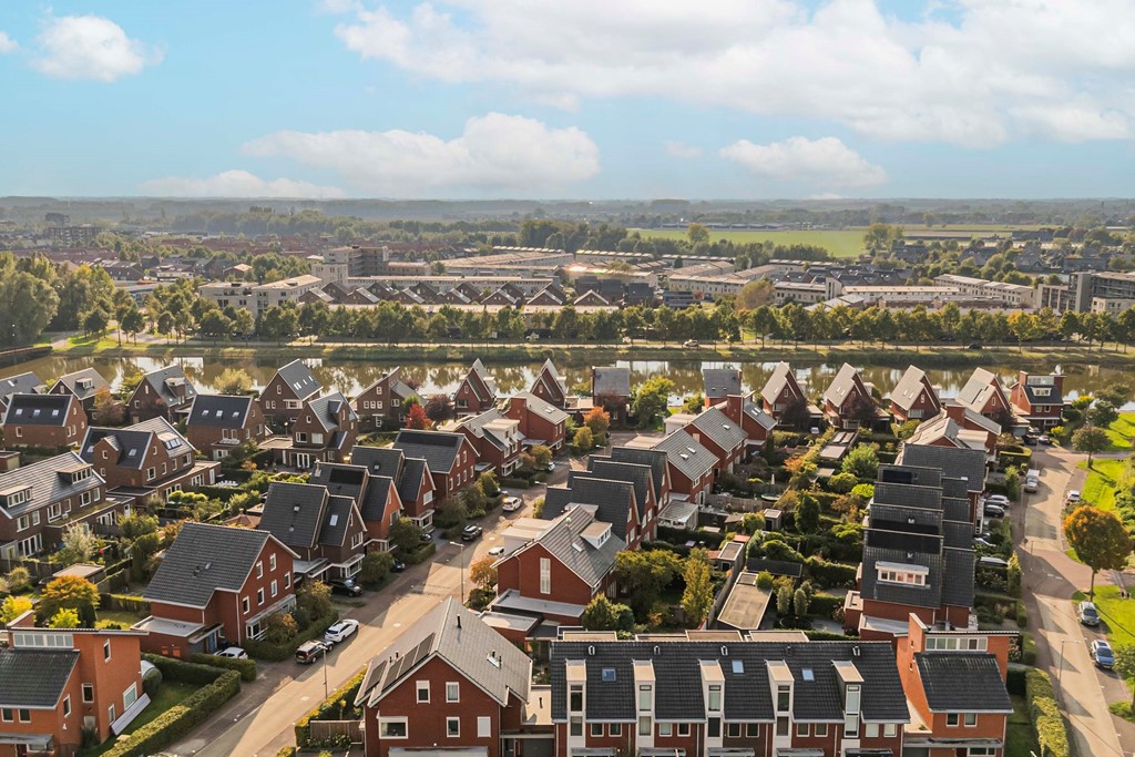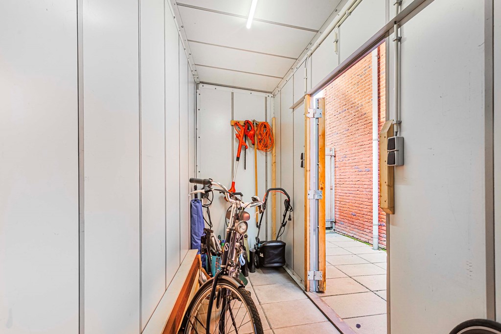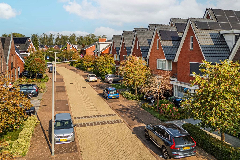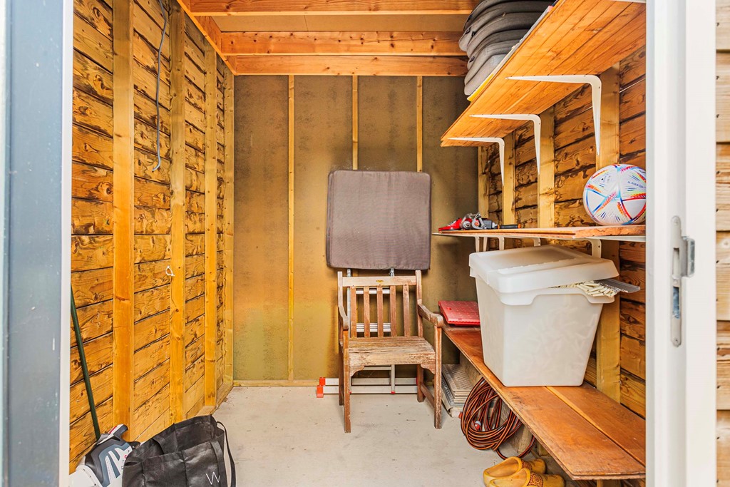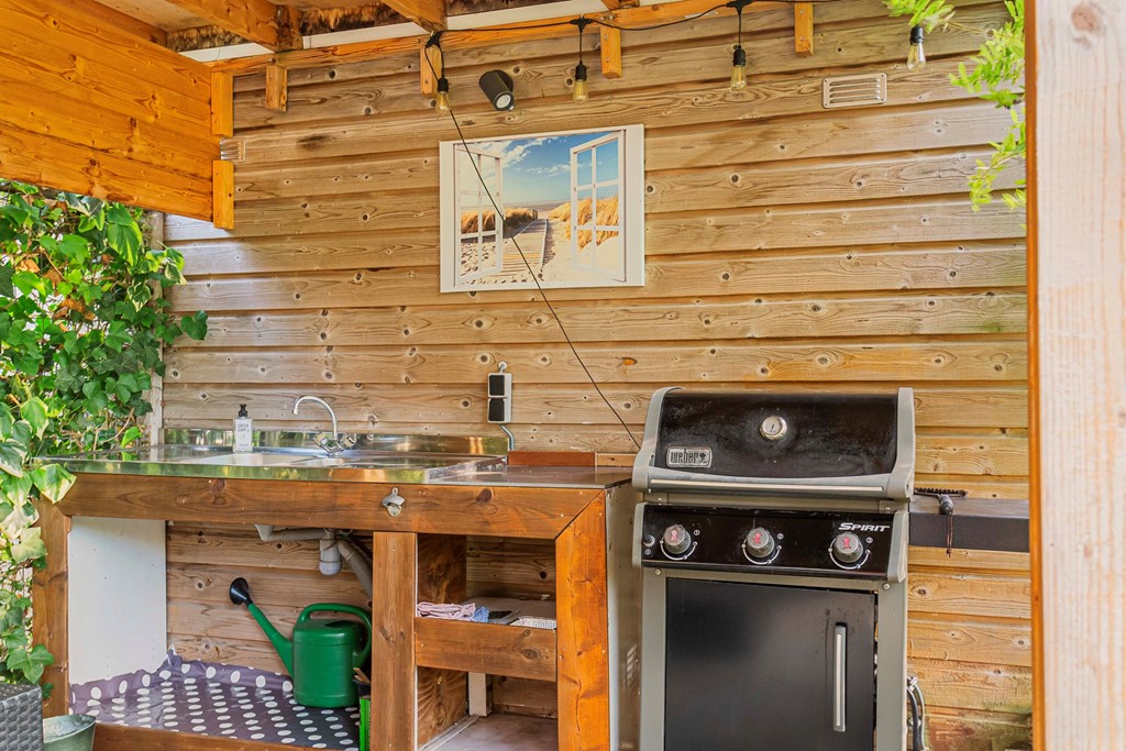 De grote achtertuin is smaakvol en praktisch aangelegd en beschikt over een veranda met buitenkeuken en barbecue, een ruim terras, een grasveld en fraai beplante borders. Daarnaast zijn er twee bergingen aanwezig en is er een eigen achterom. Op de oprit bevindt zich bovendien een laadstation voor een elektrische auto.