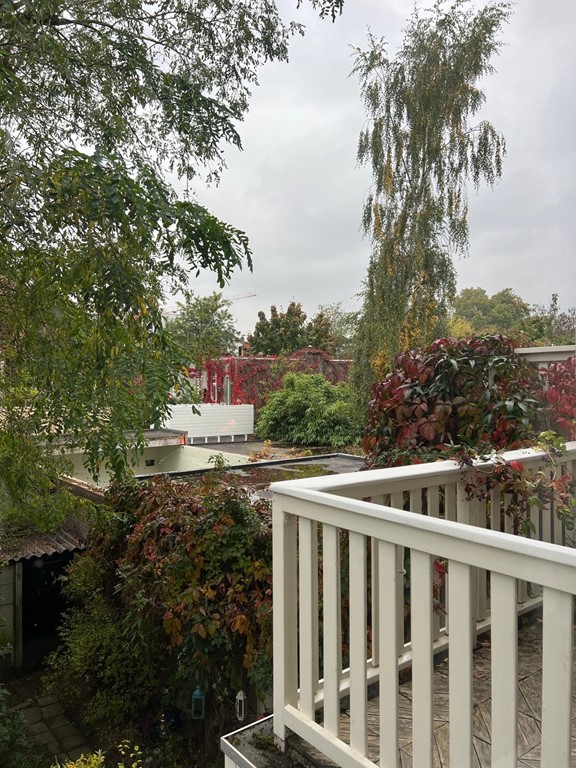 Via een eigen entree bereik je de eerste verdieping. Hier bevindt zich een moderne, volledig ingerichte keuken met onder andere een koel-vriescombinatie, vaatwasser, combi-oven en inductiekookplaat. Aan de achterzijde van de woning ligt de lichte en ruime woonkamer (ca. 25 m²) met een zonnig balkon op het zuidoosten en fraai uitzicht op het groen.