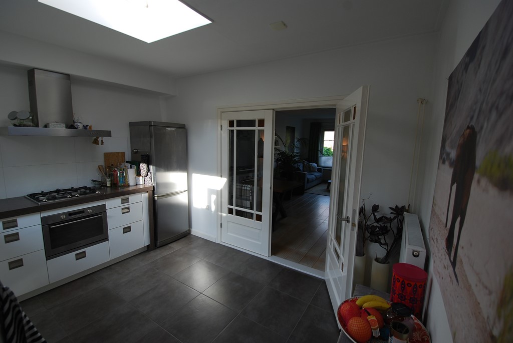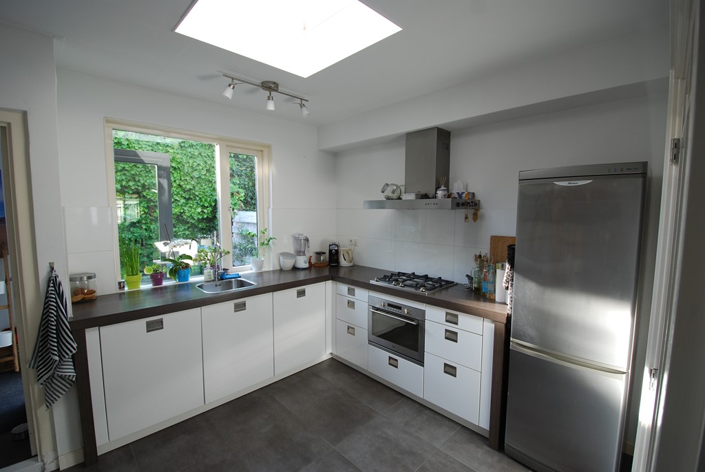 De ruime lichte keuken is voorzien van een prachtige hoogglans Systemat keuken met inbouwapparatuur. Vanuit de keuken is de toegang tot de berging en de gezellige stadstuin met achterom.