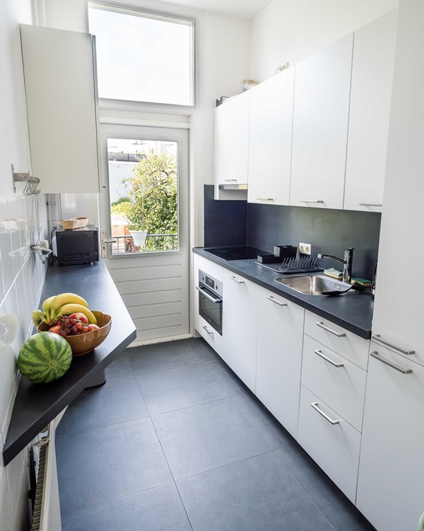 Grote overloop met doorgang naar een ruime woonkamer, de werkkamer en een moderne keuken is voorzien van de modernste uitrusting, zoals een keramische kookplaat, oven, een aparte magnetron, vaatwasser, een grote ijskast en een aparte vriezer. Ook staat er een Nespresso apparaat en een waterkoker. Via de keuken heb je toegang tot het verbrede balkon waar je heerlijk onder het genot van een kop koffie kan genieten van de grote groene tuinen die de wijk Burgermeesterkwartier rijk is.