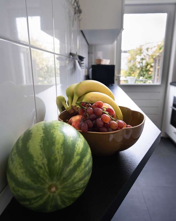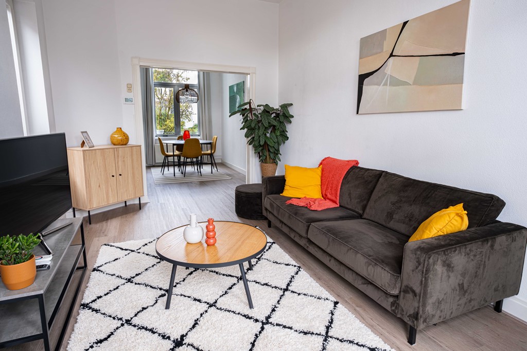 De sfeervolle living is opgedeeld in een diner gedeelte en een lounge gedeelte. In de voorkamer met uitzicht op straat kun je ontspannen op een heerlijke loungebank. In de achterkamer kun je heerlijk dineren aan de ronde tafel met zicht op het balkon en de groene tuinen van de wijk.