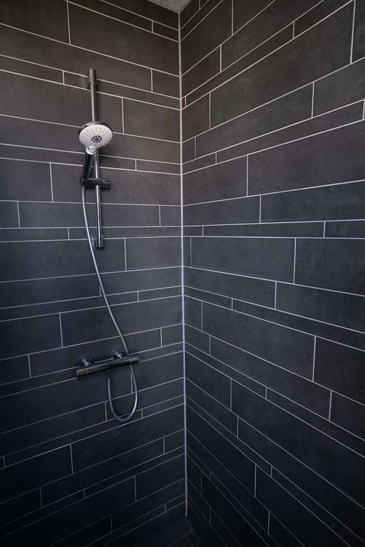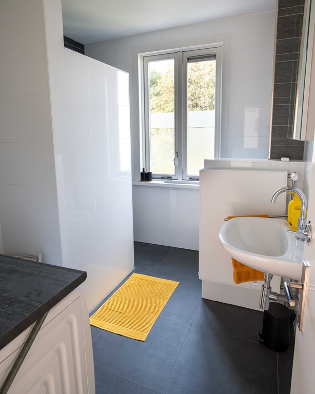 De ruime moderne badkamer is voorzien van vloerverwarming en bevat een inloopdouche, toilet, wasmachine en droger.