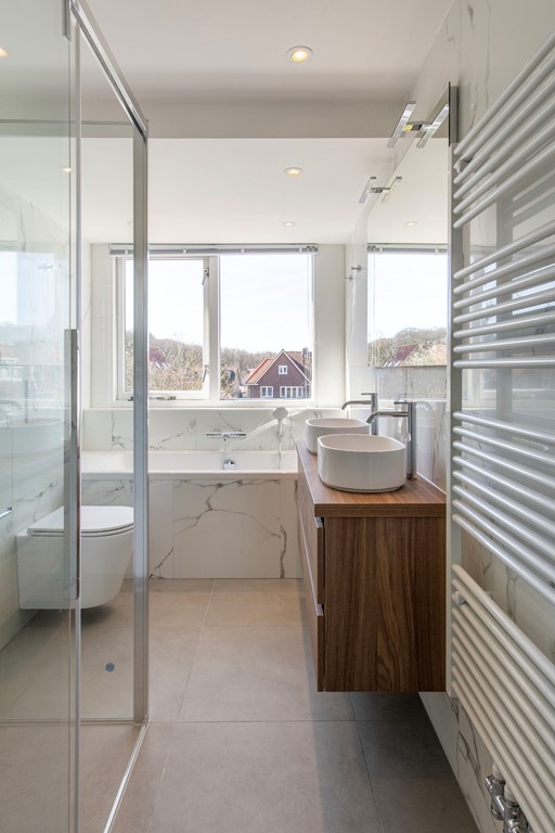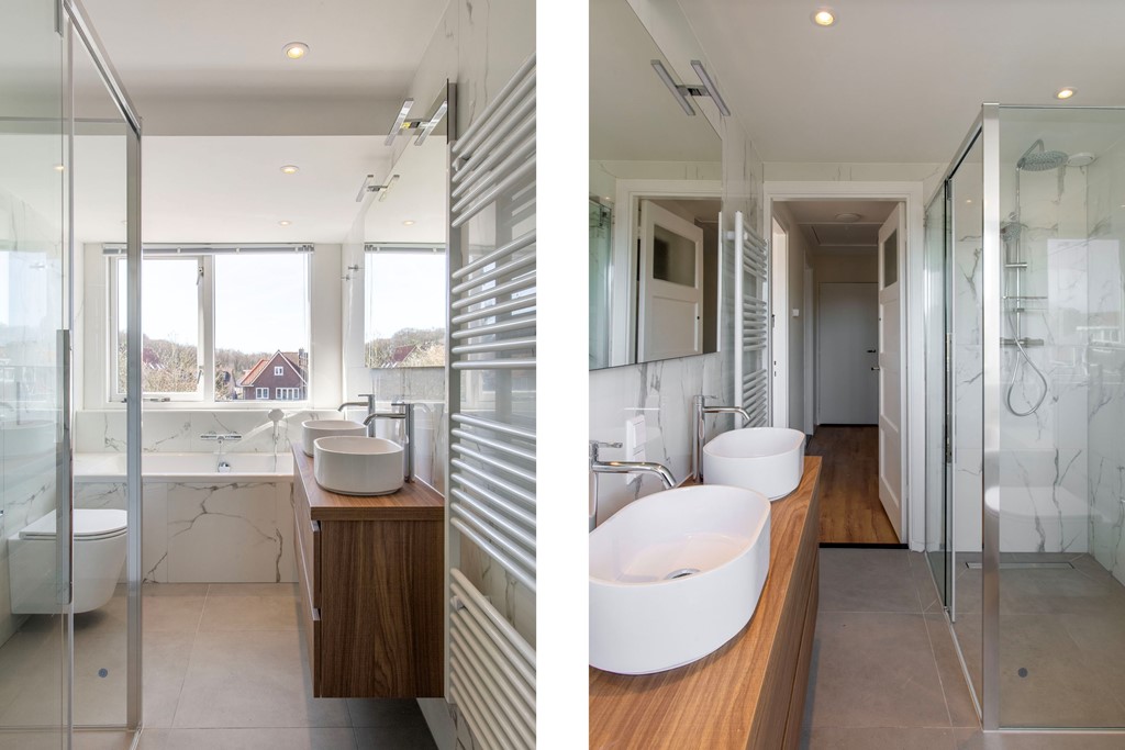 De luxe en royale badkamer is voorzien van een dubbele wastafel, een ruime inloopdouche, een ligbad en een tweede toilet.