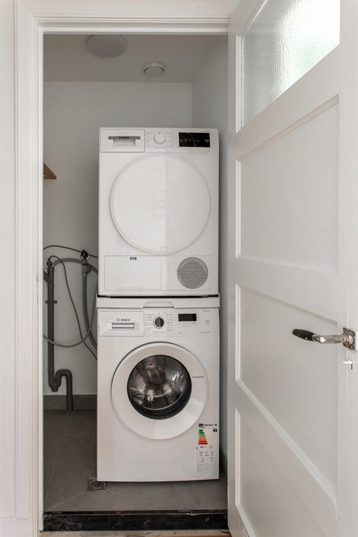 Op de overloop bevindt zich een royale kast met een gloednieuwe Bosch wasmachine en droger. Daarnaast is er nog een separate berging.