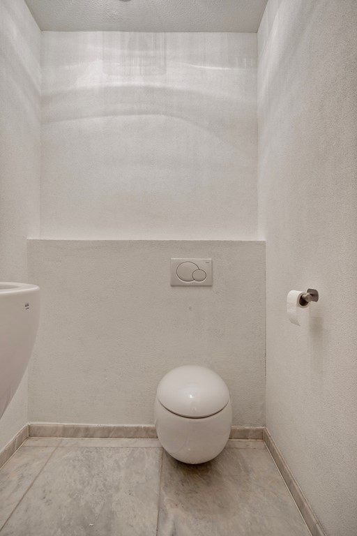 Hal, riant modern toilet met fontein, berging met aansluitingen voor de wasmachine en droger.
