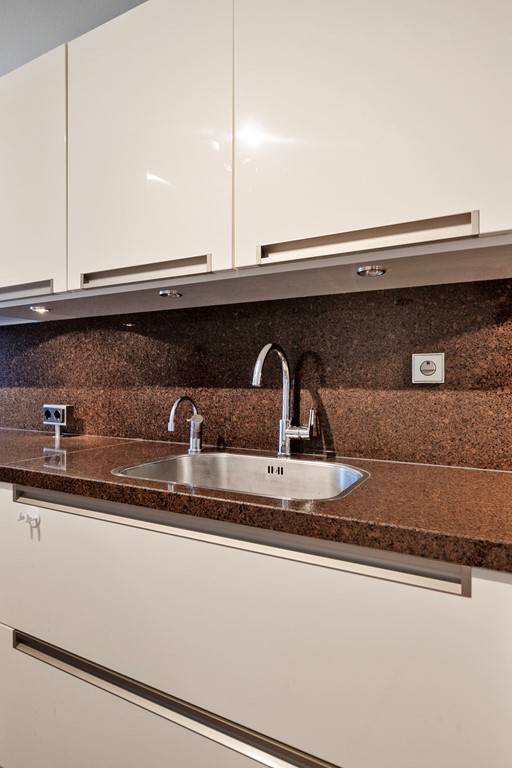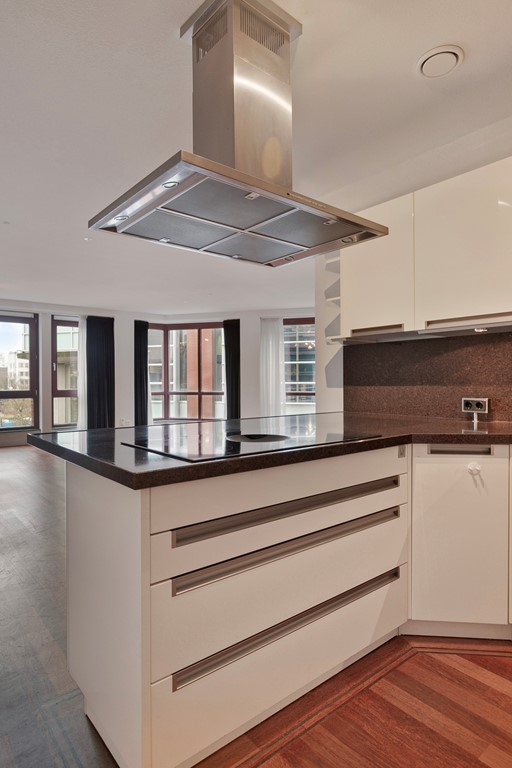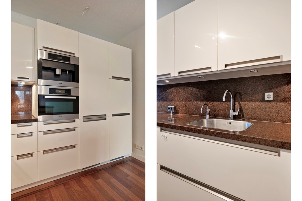 Vanuit de hal loop je door naar de zeer ruime en lichte woonkamer met schitterend uitzicht van alle kanten. De open keuken in U-vorm is voorzien van diverse moderne inbouwapparatuur van Miele zoals: koelkast, vriezer, inductiekookplaat, koffiemachine, Quooker en afzuigkap. Vanuit de woonkamer heb je toegang tot de tweede slaap/ werkkamer.