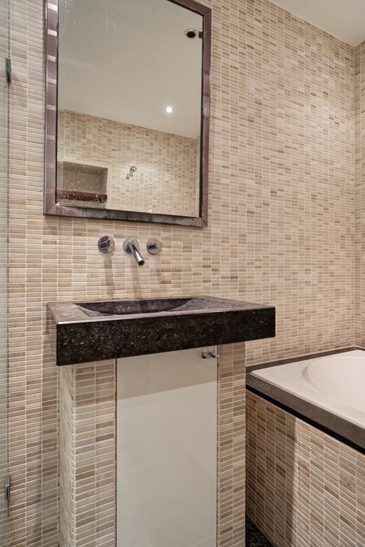 De badkamer is uitgerust met een douche, wastafel en een heerlijke relax jacuzzi.