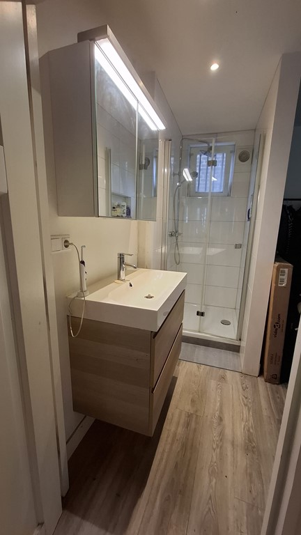 Verder beschikt het appartement over een separaat toilet met fonteintje en een compacte slaapkamer met en-suite inloopdouche.