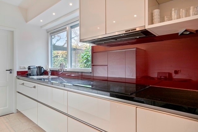 De dichte keuken is voorzien van inbouwapparatuur: inductiekookplaat, afzuigkap, koelkast met vriesvak en oven.