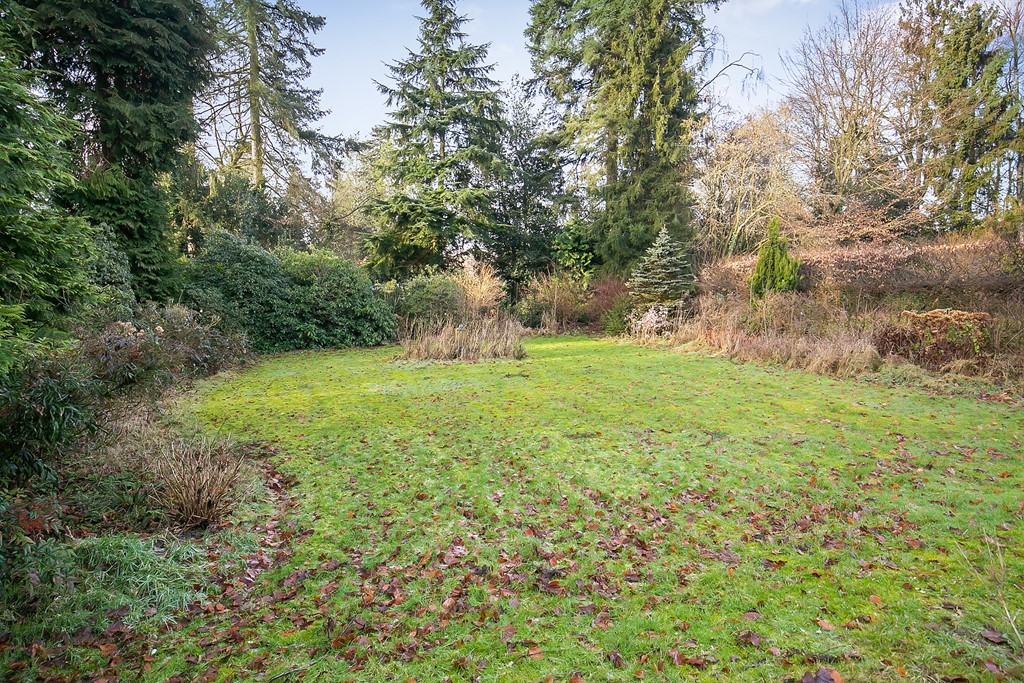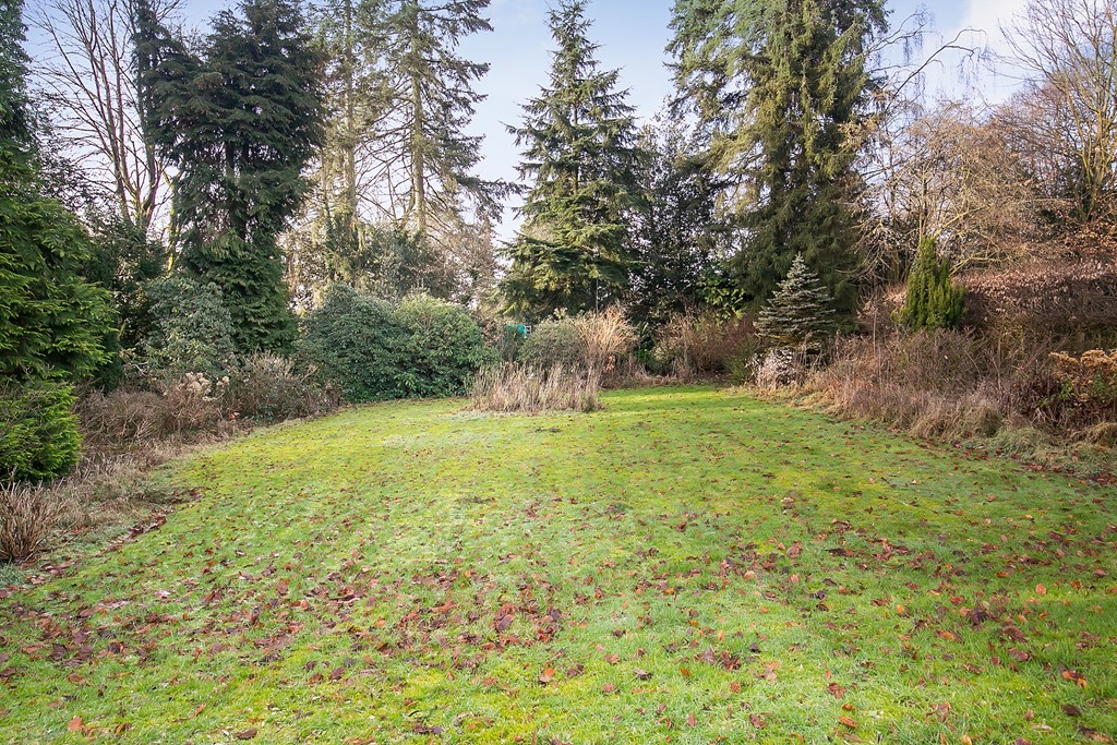 Grote voortuin met gazon en heg.