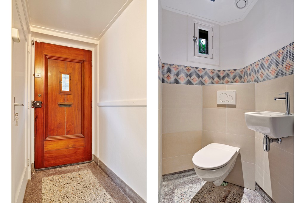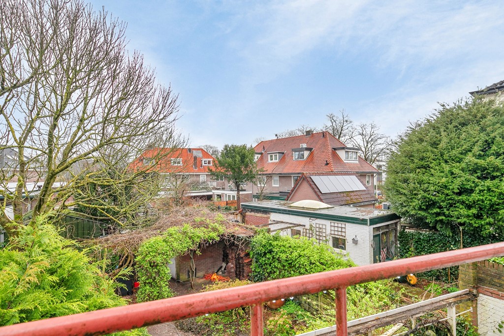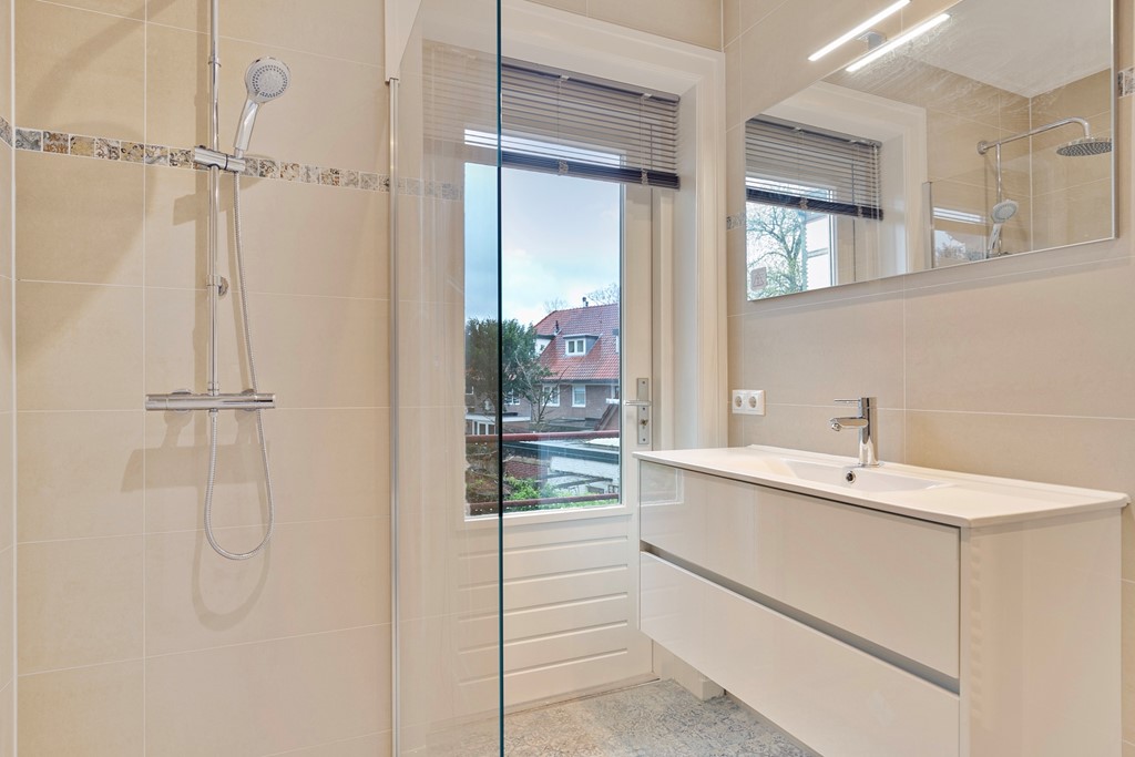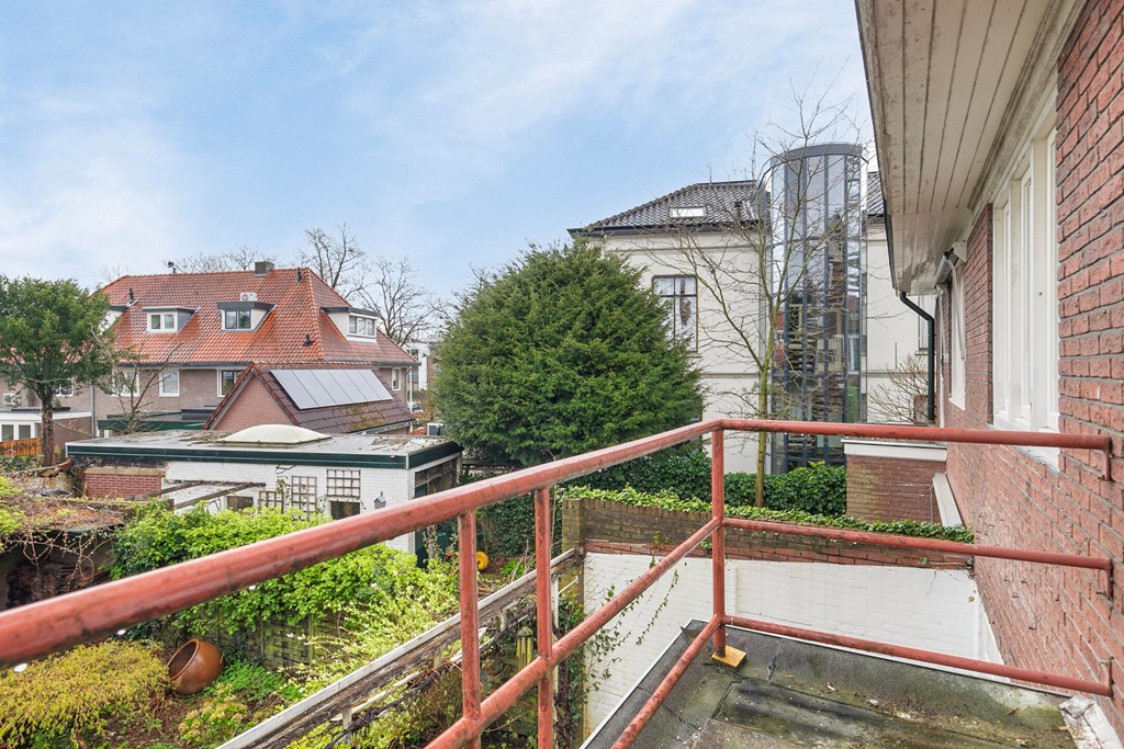 Vanuit de badkamer is er een uitgang naar het balkon, met zicht op de achtertuin.