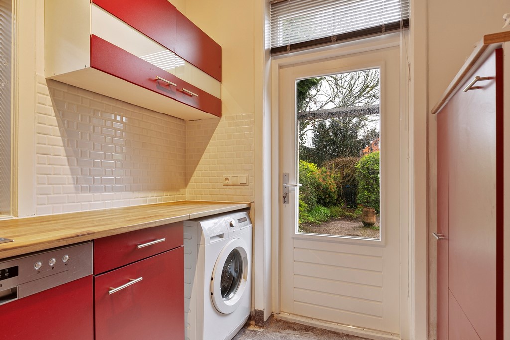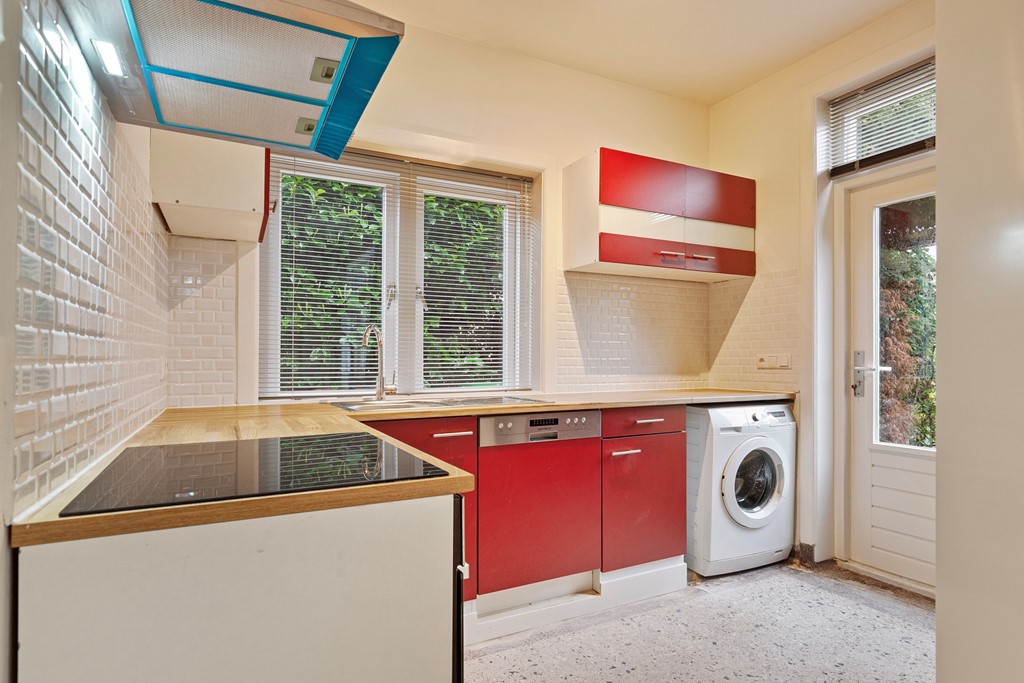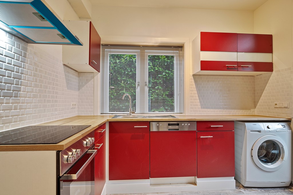 De keuken is voorzien van apparatuur waaronder een inductiekookplaat, een oven, een koelkast, een vaatwasser en een wasmachine.