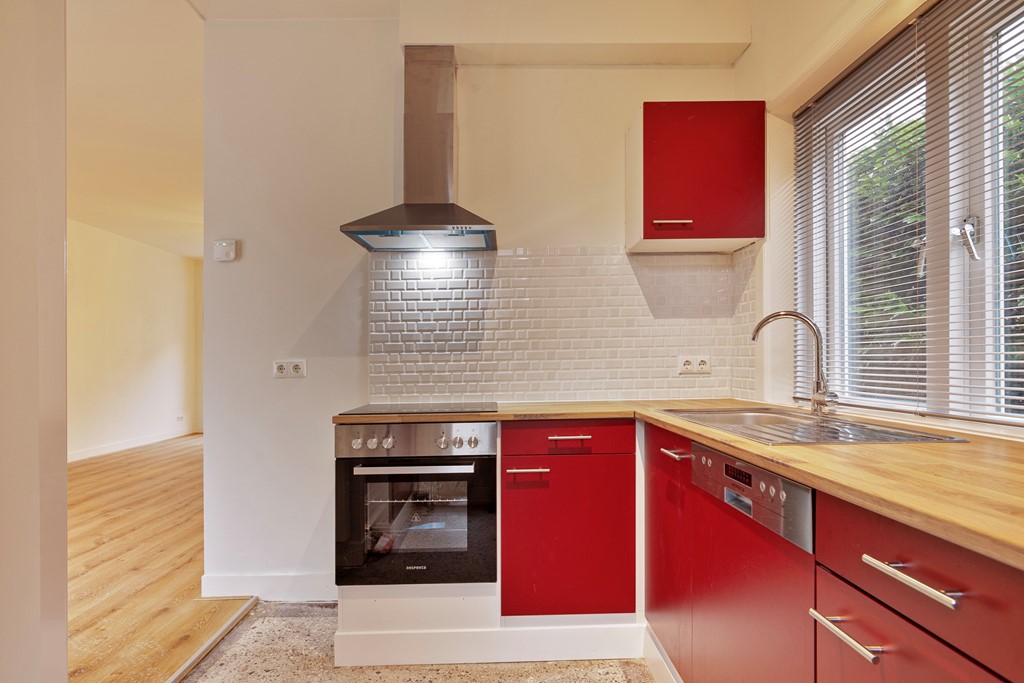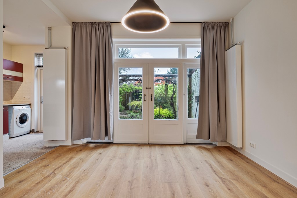 Entree, hal met meterkast, trap naar ruime kelder, modern toilet met fonteintje. De woonkamervloer is voorzien van laminaat. De leefruimte is verdeeld in een L-vormig woongedeelte en een half open keuken.