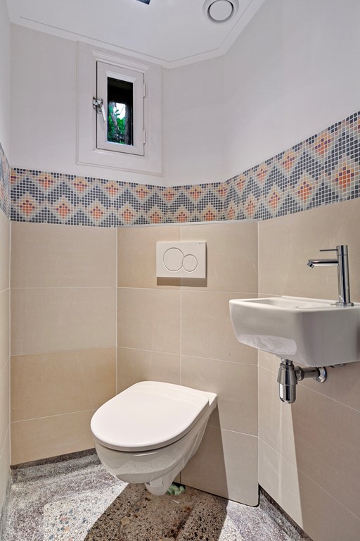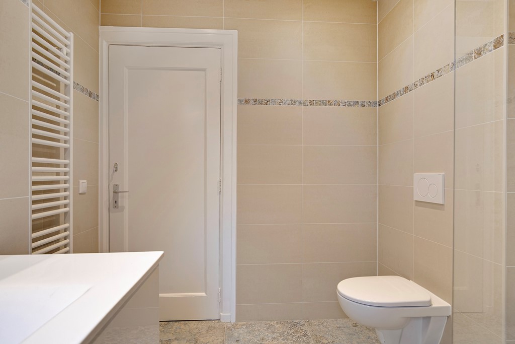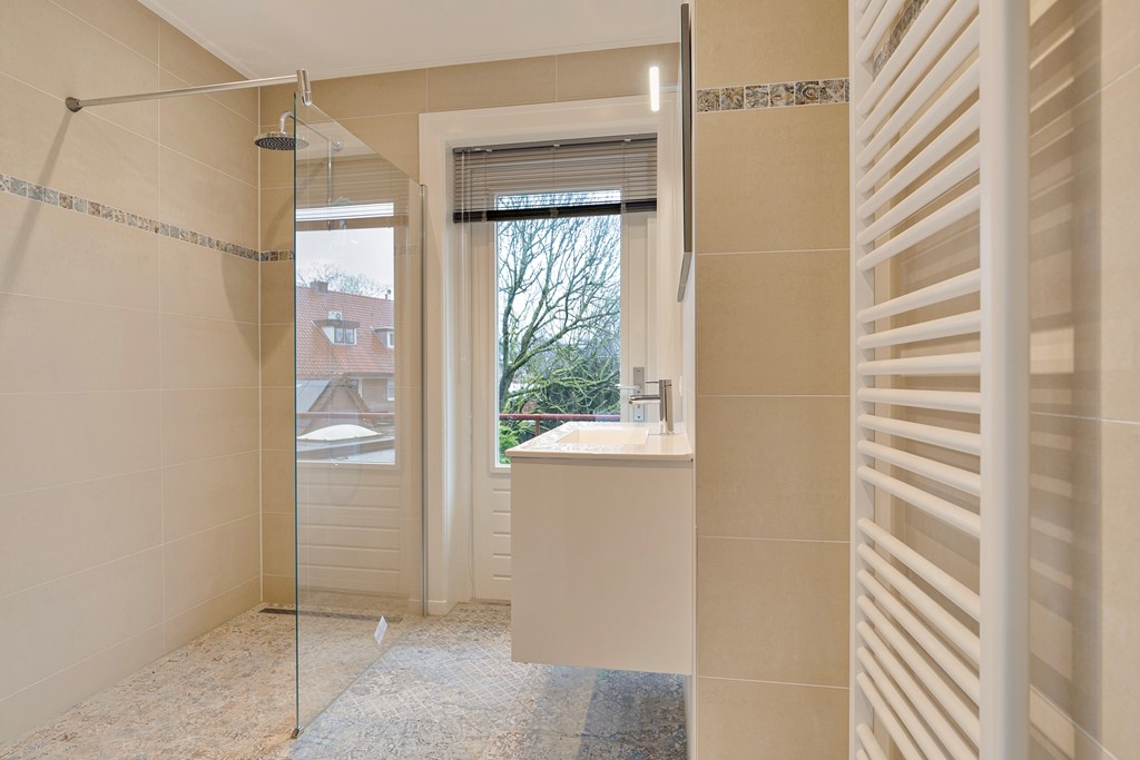 De mooi afgewerkte badkamer heeft een inloopdouche, tweede toilet, design radiator en een groot wastafelmeubel.
