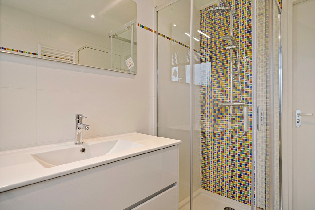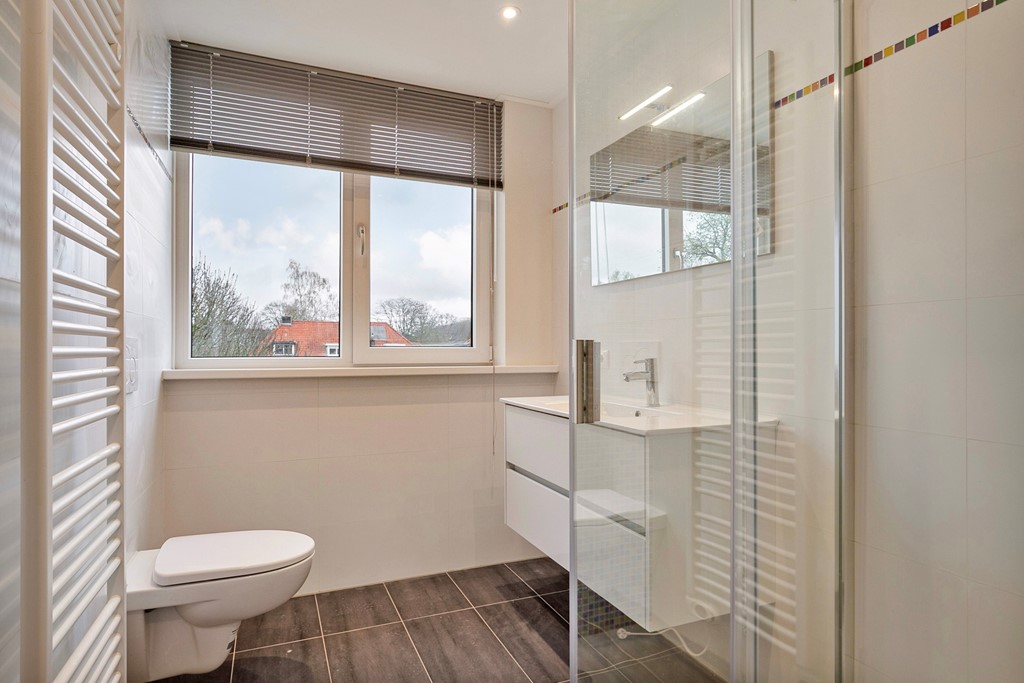 Ook bevindt zich hier een tweede badkamer. Deze ruimte is voorzien van een douchecabine, wastafelmeubel en spiegel, designradar en toilet.