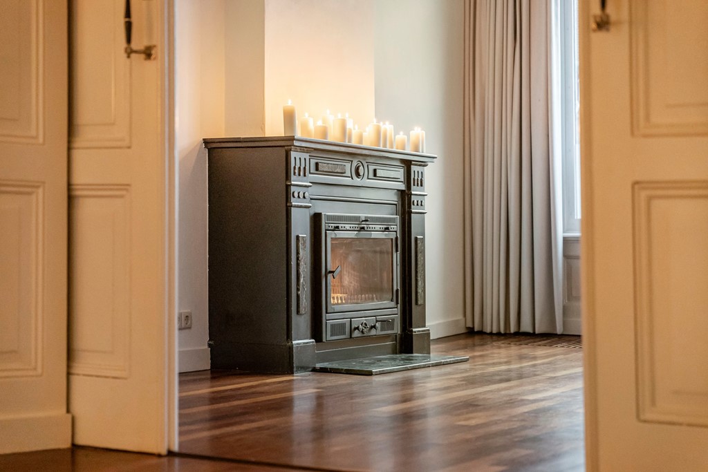 De aangrenzende eetkamer sluit hier naadloos op aan. Ook hier zijn de authentieke details met zorg behouden. De tweede houtkachel, de originele schouw en het spel van licht en ruimte zorgen voor een uitnodigende ambiance — perfect voor lange avonden tafelen.