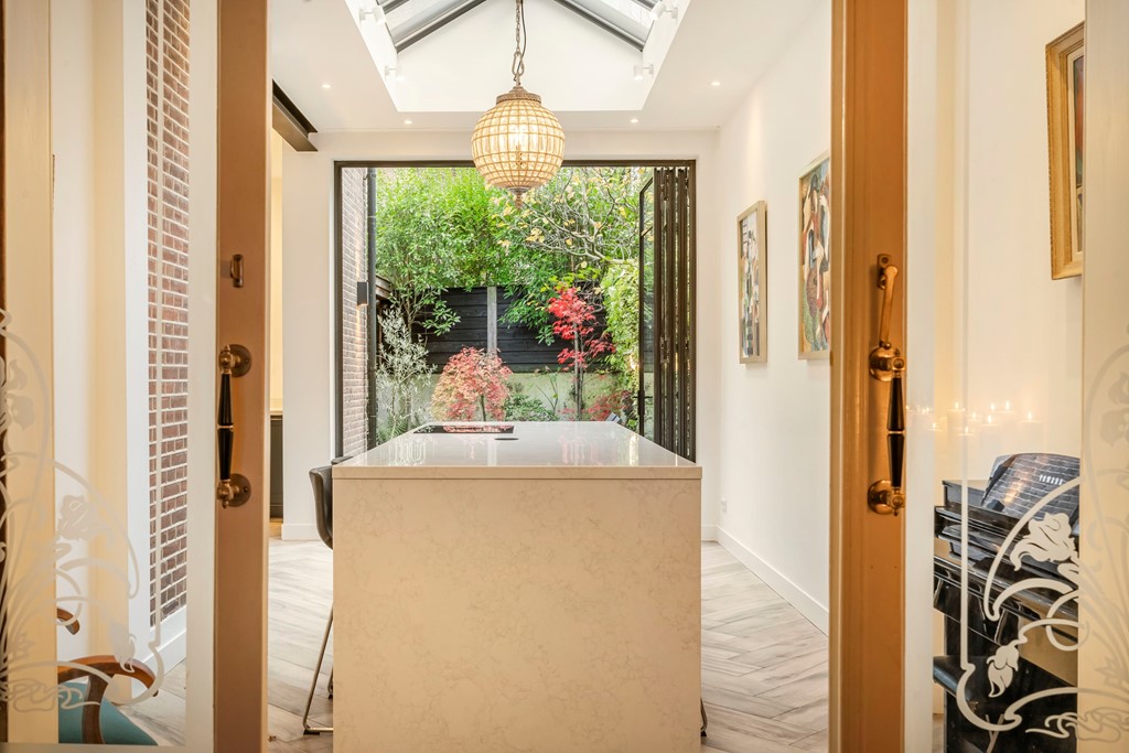 Achter de eetkamer bevindt zich de uitgebouwde leefkeuken — een absolute eyecatcher. Hier komen ambacht en design samen. Het grote kookeiland vormt het hart van de ruimte: een plek waar koken, borrelen en samenzijn vanzelf in elkaar overlopen.
