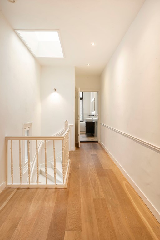 De statige houten trap leidt naar de eerste verdieping, waar een royale overloop toegang biedt tot de luxe badkamer, een separaat toilet, een thuiswerkruimte en de master bedroom.