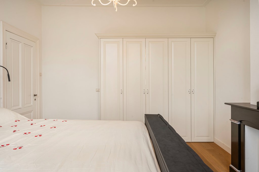 De master bedroom aan de voorzijde is ruim, licht en elegant. De maatwerk kastenwand biedt volop bergruimte en is volledig in stijl met de woning ontworpen. Ook hier is de materiaalkeuze weer van bijzonder hoog niveau. Een bijzondere doorgang in deze kastenwand leidt naar een tweede kamer welke perfect gebruikt kan worden als walk-in closet, eveneens zeer hoogwaardig afgewerkt, met toegang tot een fraai dakterras. Hier is het ’s avonds heerlijk vertoeven - een zeldzaam stukje privé buitenruimte midden in de stad.