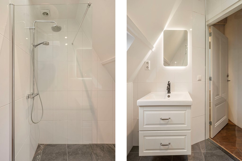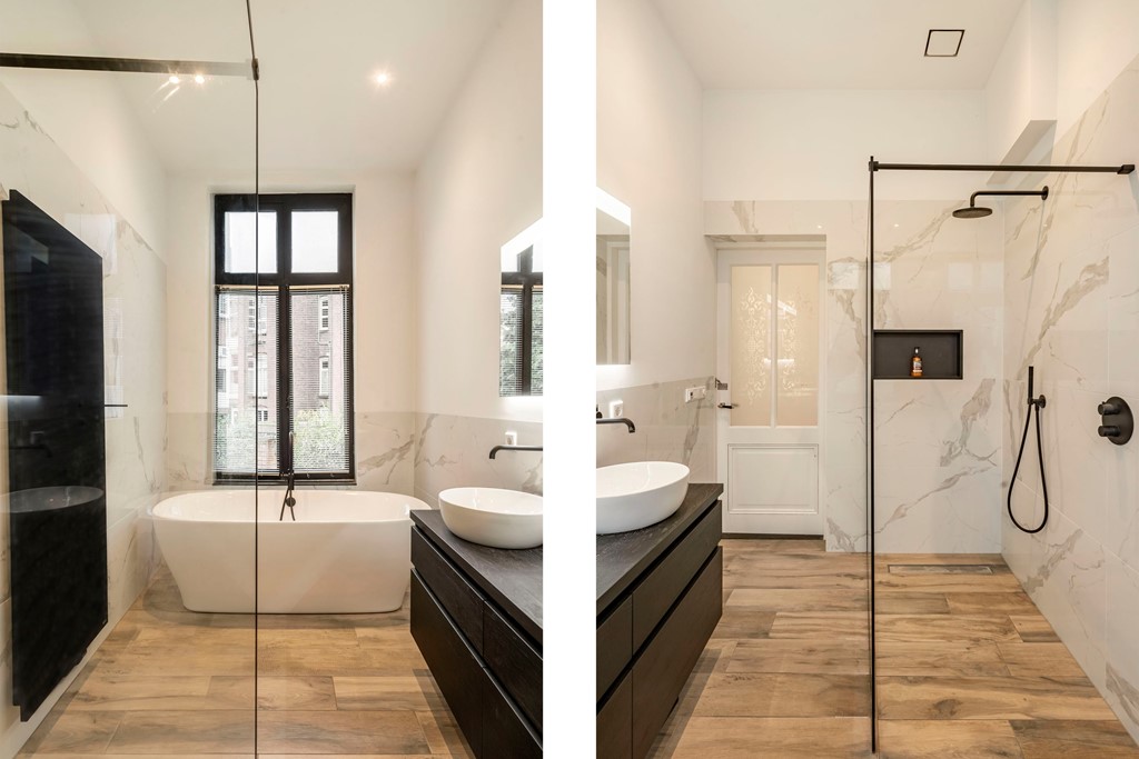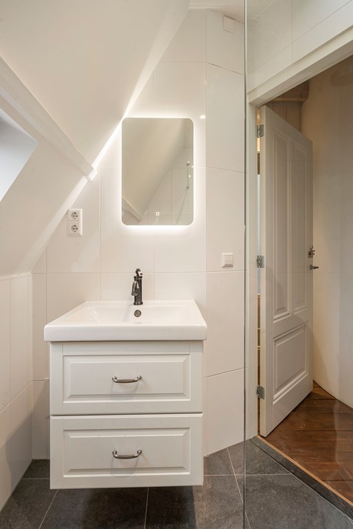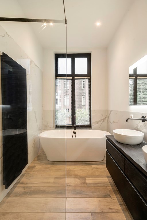 De badkamer is een oase van rust en stijl: een vrijstaand ligbad, ruime inloopdouche, dubbel wastafelmeubel en elektrische vloerverwarming maken het geheel compleet. De materialen zijn zorgvuldig gekozen en de afwerking is tot in perfectie uitgevoerd en staat op eenzame hoogte.