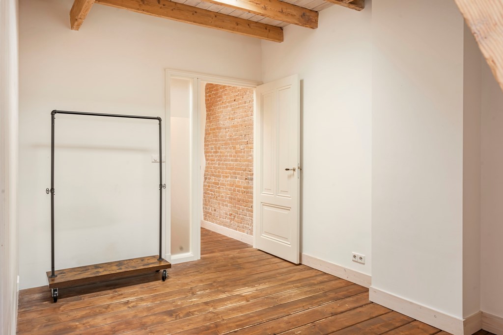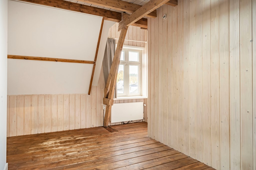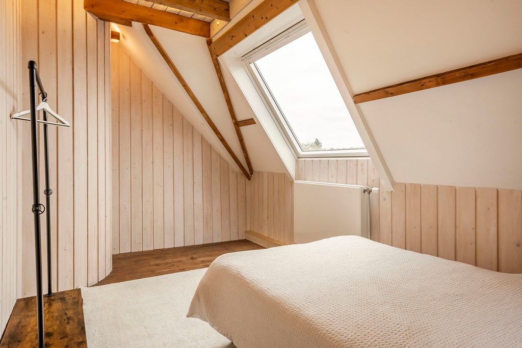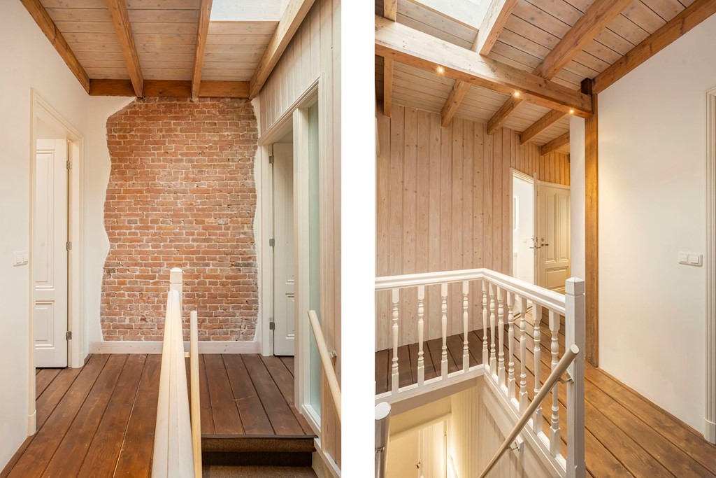 De bovenste verdieping verrast opnieuw met haar ruimtelijkheid en karakter. Drie volwaardige slaapkamers bieden plaats aan gezin, gasten of hobby’s. Het zichtbare metselwerk, de houten spanten en de subtiele verlichting creëren een bijzondere, warme sfeer. De wanden zijn op de houten vloer geplaatst, zodat een eventuele aanpassing in de indeling binnen handomdraai gerealiseerd kan worden.