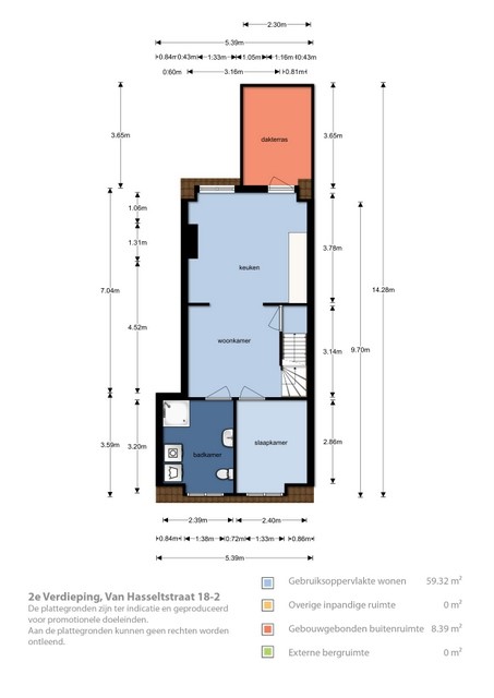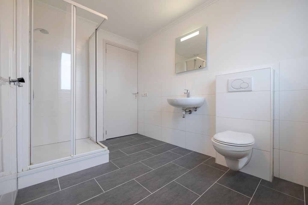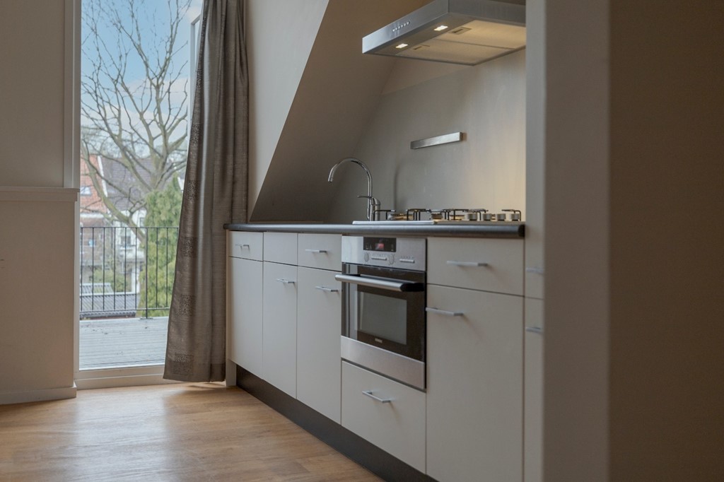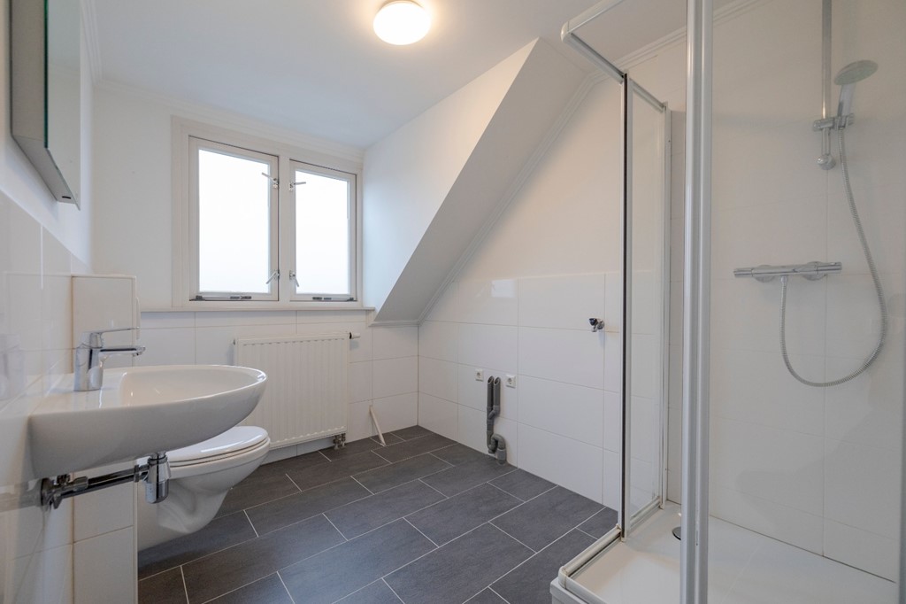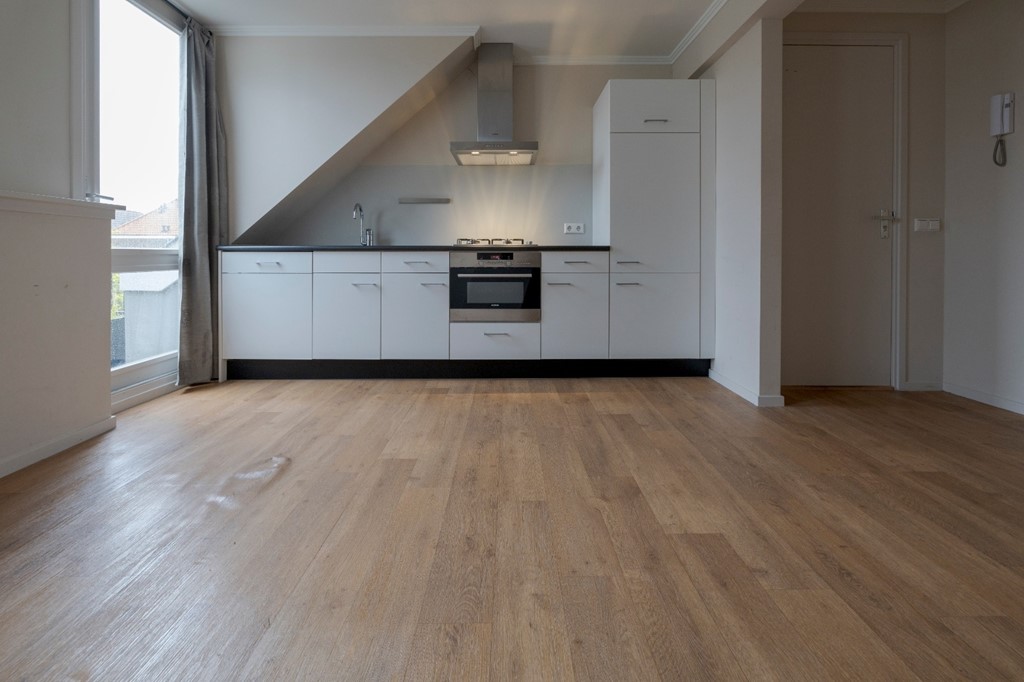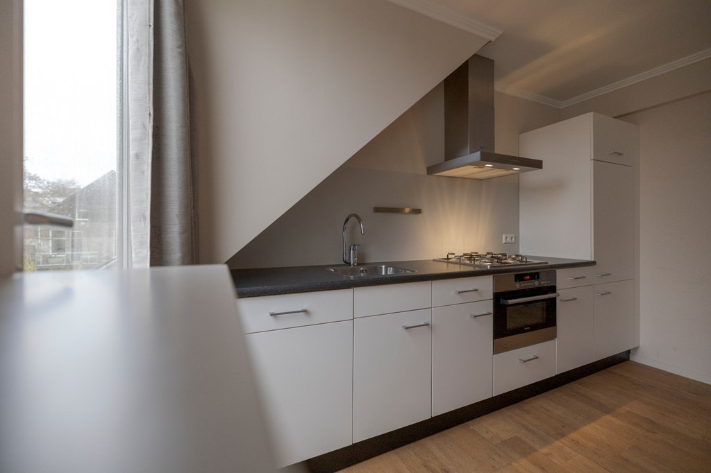 Entree, woonkamer met toegang tot het royale dakterras aan de achterzijde (ca. 9m²), nieuwe open keuken voorzien van Bosch en Miele inbouwapparatuur, slaapkamer aan de voorzijde (ca. 8m²), vernieuwde moderne badkamer (ca. 8m²) met douche, vaste wastafel, hangtoilet en aansluiting voor de wasmachine.