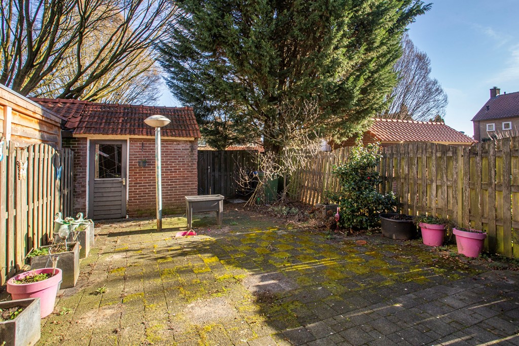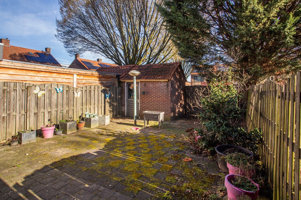 De woning staat op een ruim perceel en beschikt over een grote achtertuin. Achter de berging is, samen met de aangrenzende percelen, een besloten binnentuin gerealiseerd. Hiervoor hebben de bewoners ieder een klein gedeelte van hun eigen achtertuin beschikbaar gesteld, waardoor een gezamenlijke groene en beschutte buitenruimte is ontstaan waar men prettig kan verblijven.