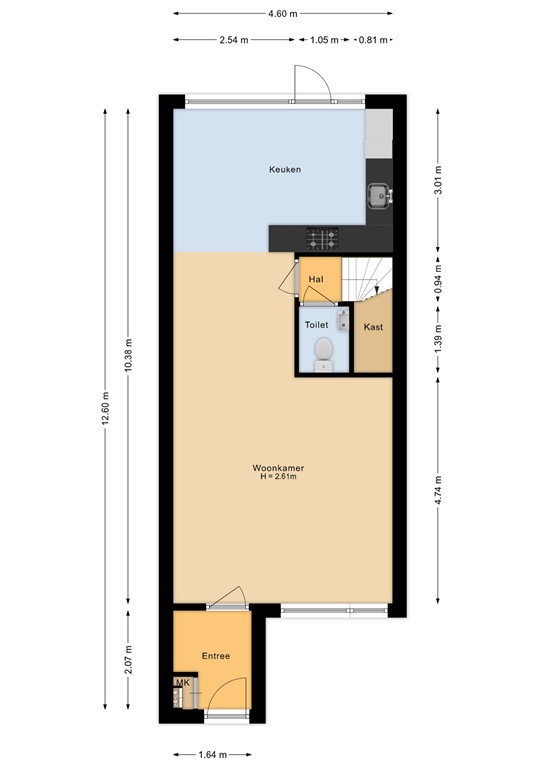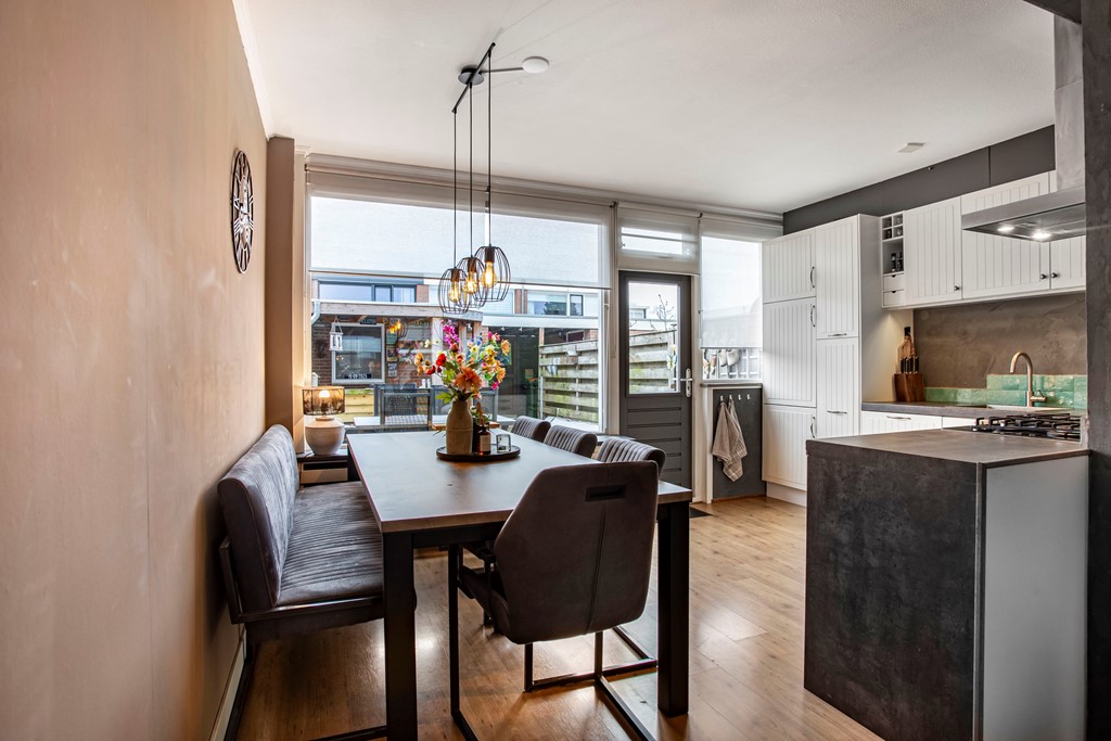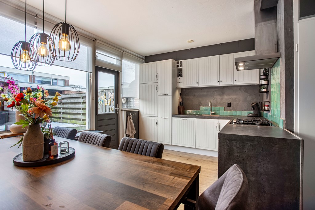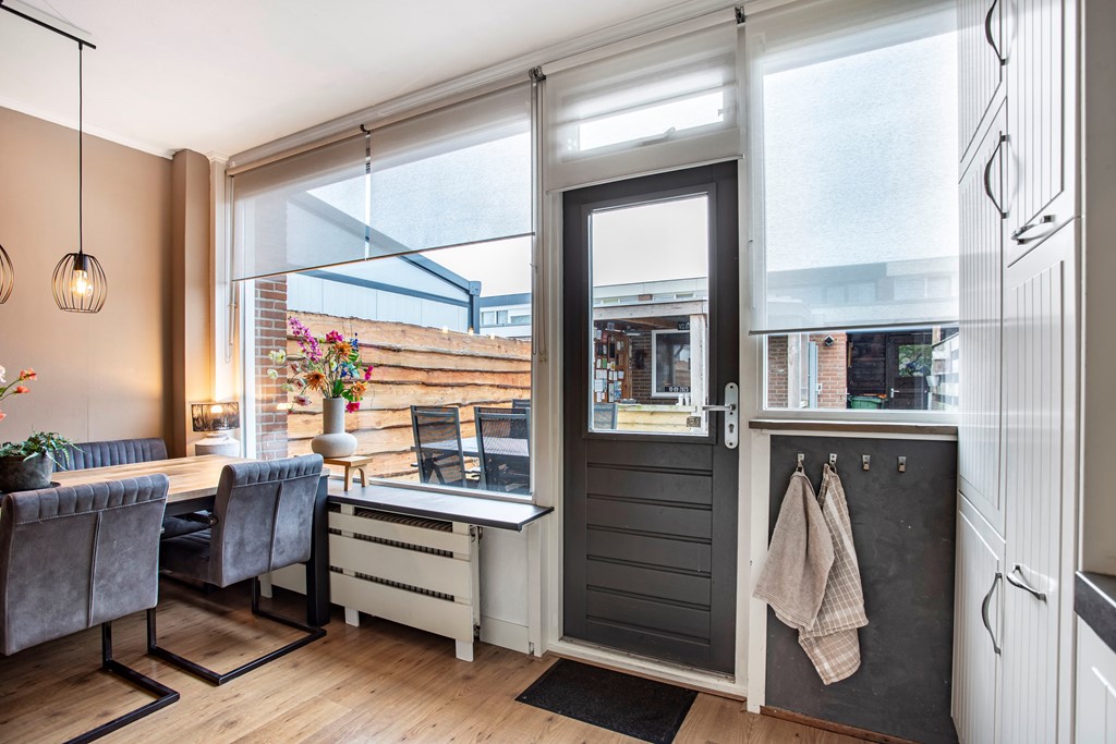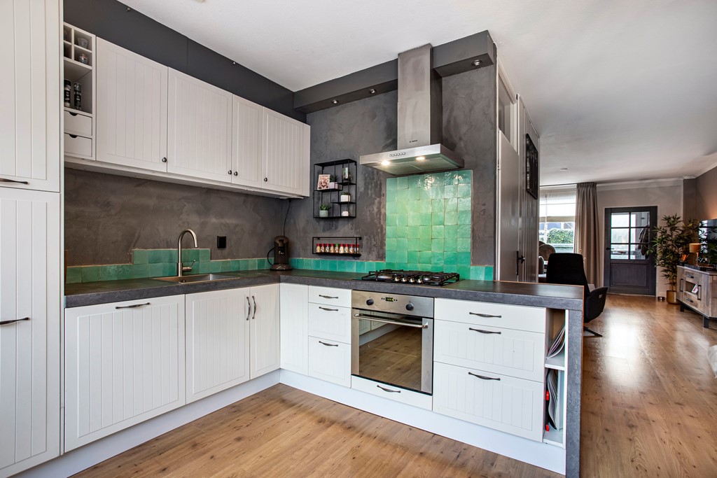 In de entree bevinden zich de meterkast en toegang tot de gezellige woonkamer. Deze ruimte heeft een knusse uitstraling, ideaal voor wie houdt van een behaaglijke, besloten sfeer in huis. Via de woonkamer bereik je de praktische trapkast en de ruim opgezette keuken in lichte kleurstelling. De keuken is voorzien van volop kastruimte en diverse inbouwapparatuur, waaronder een nieuwe koelkast, vriezer, vaatwasser, gaskookplaat, oven en afzuigkap.
